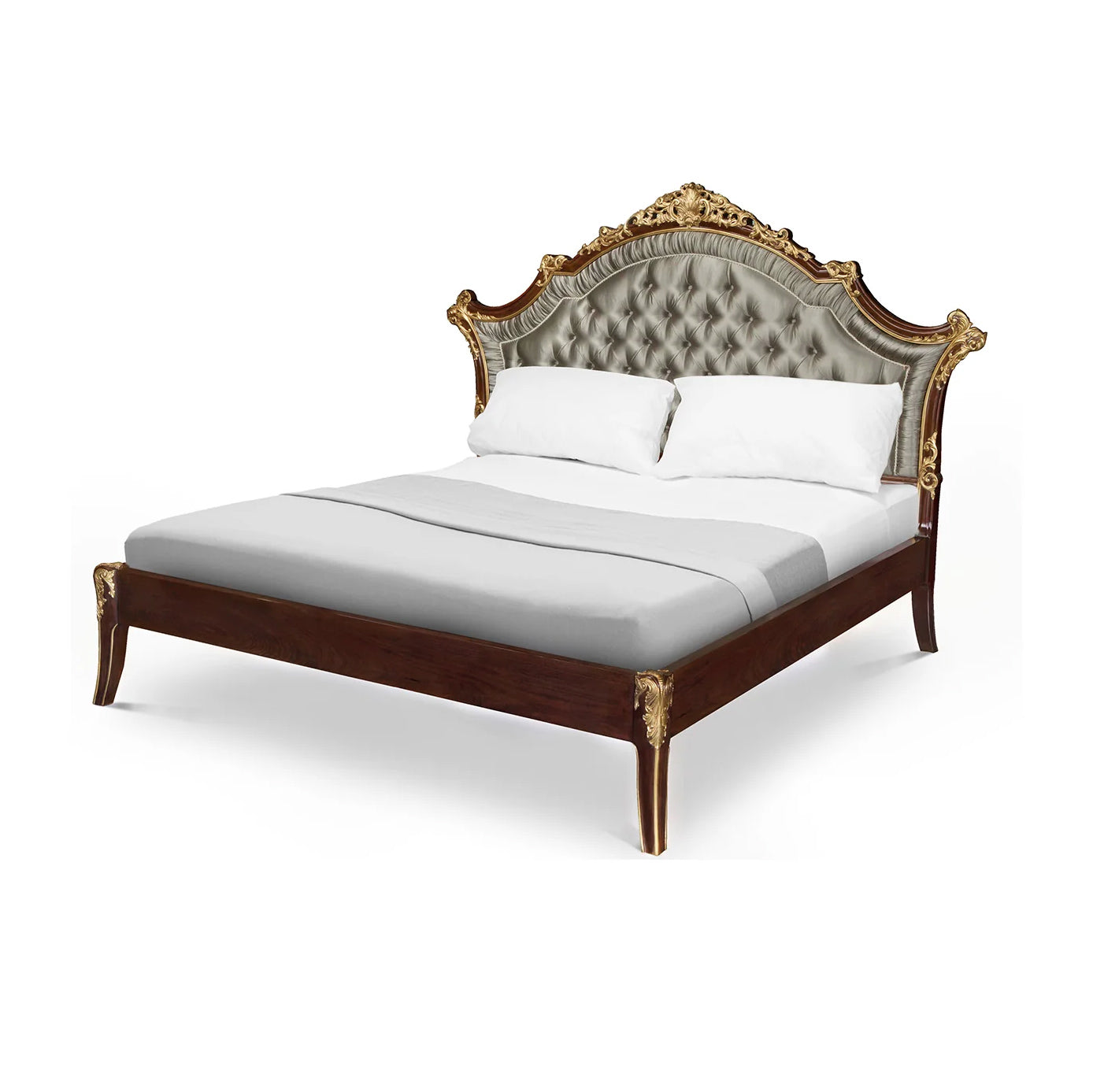 Finely hand-carved and Gold Gilded tufted fabric upholstered King Bed.