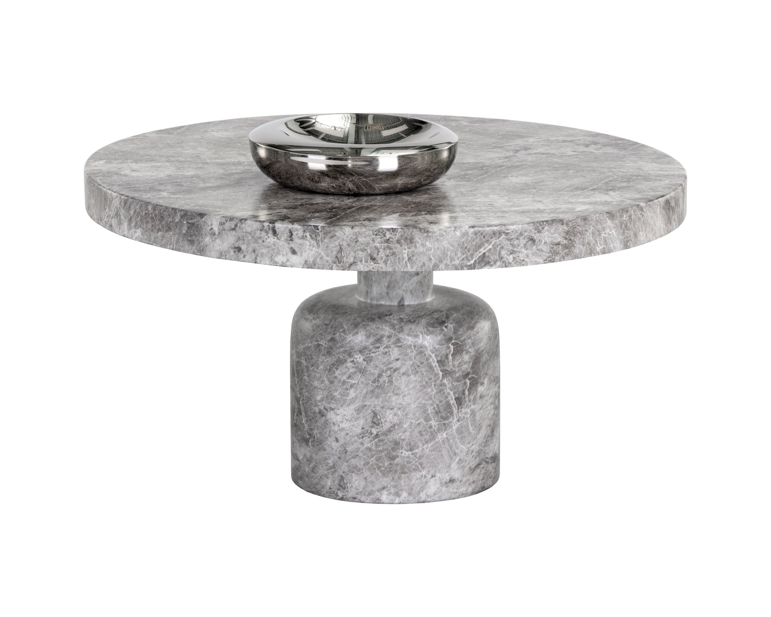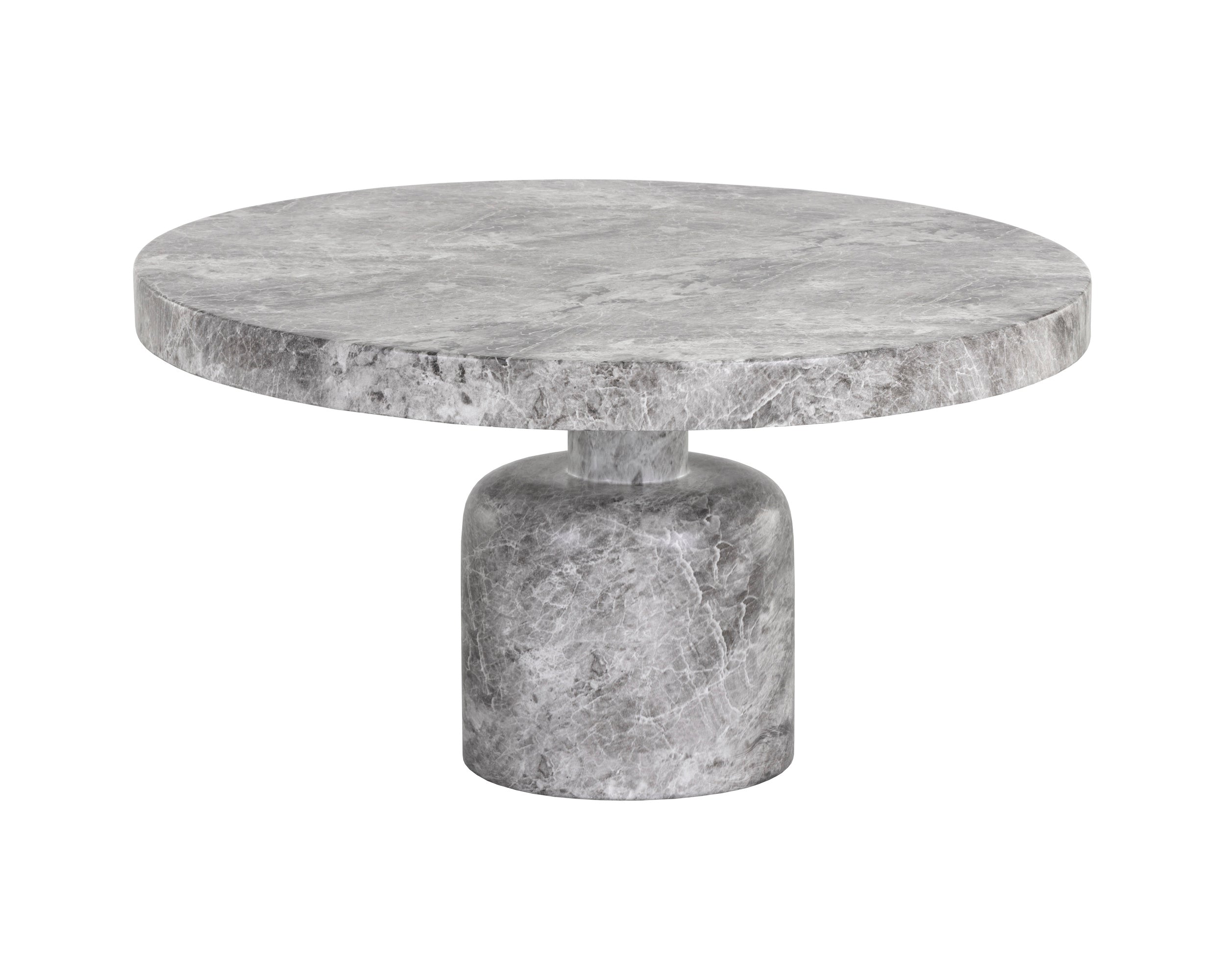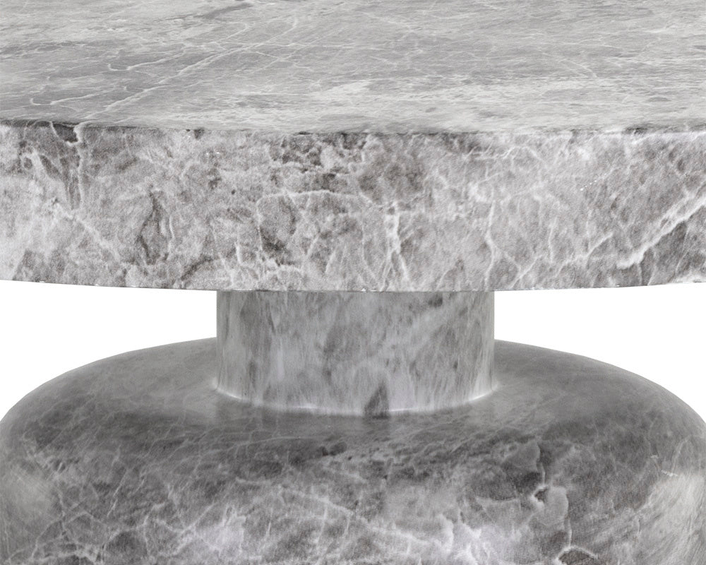 A clasically chic coffee table with an elegant design. Featured a round tabletop with a curved table base in matching grey faux marble finished concrete.