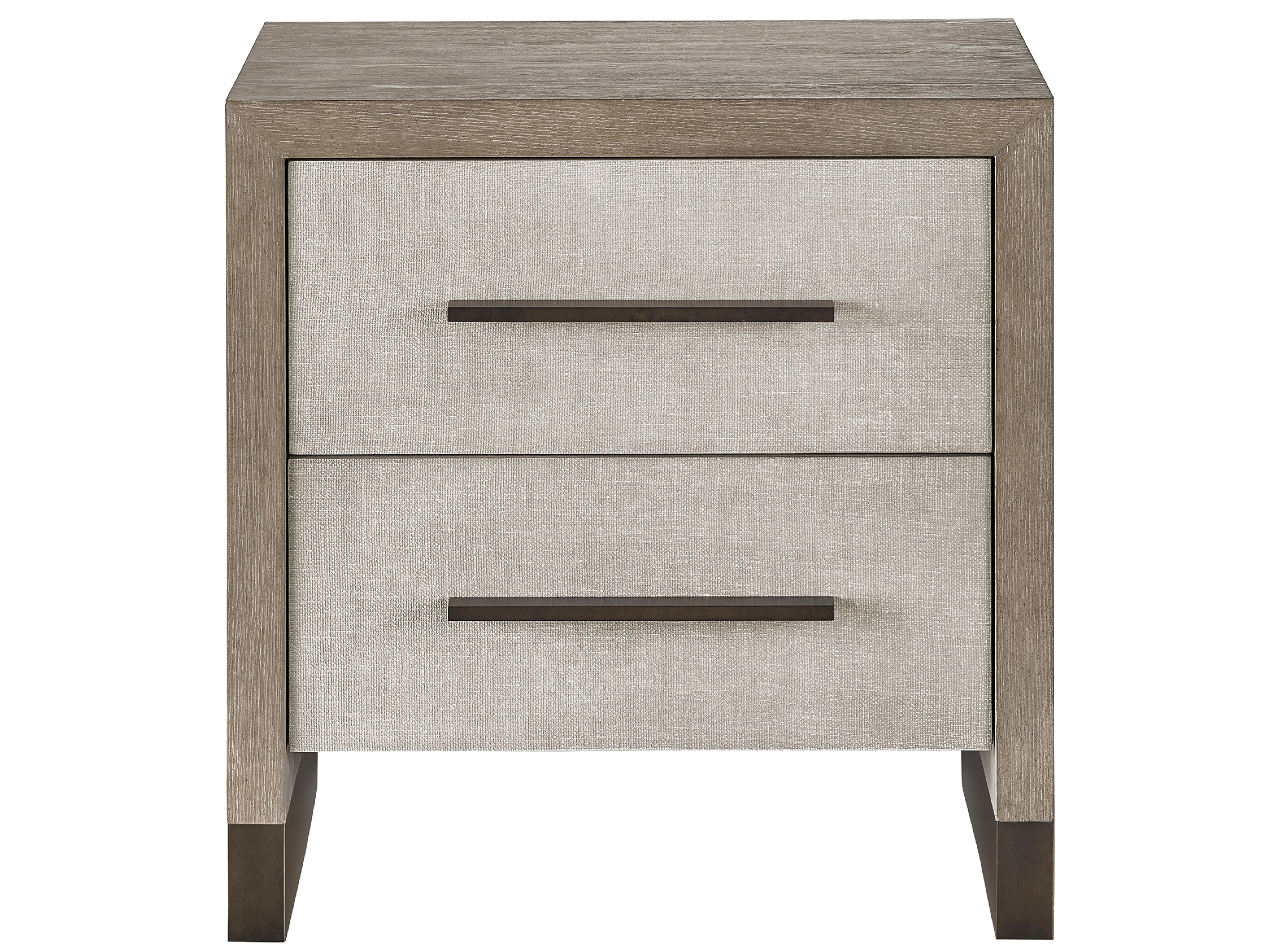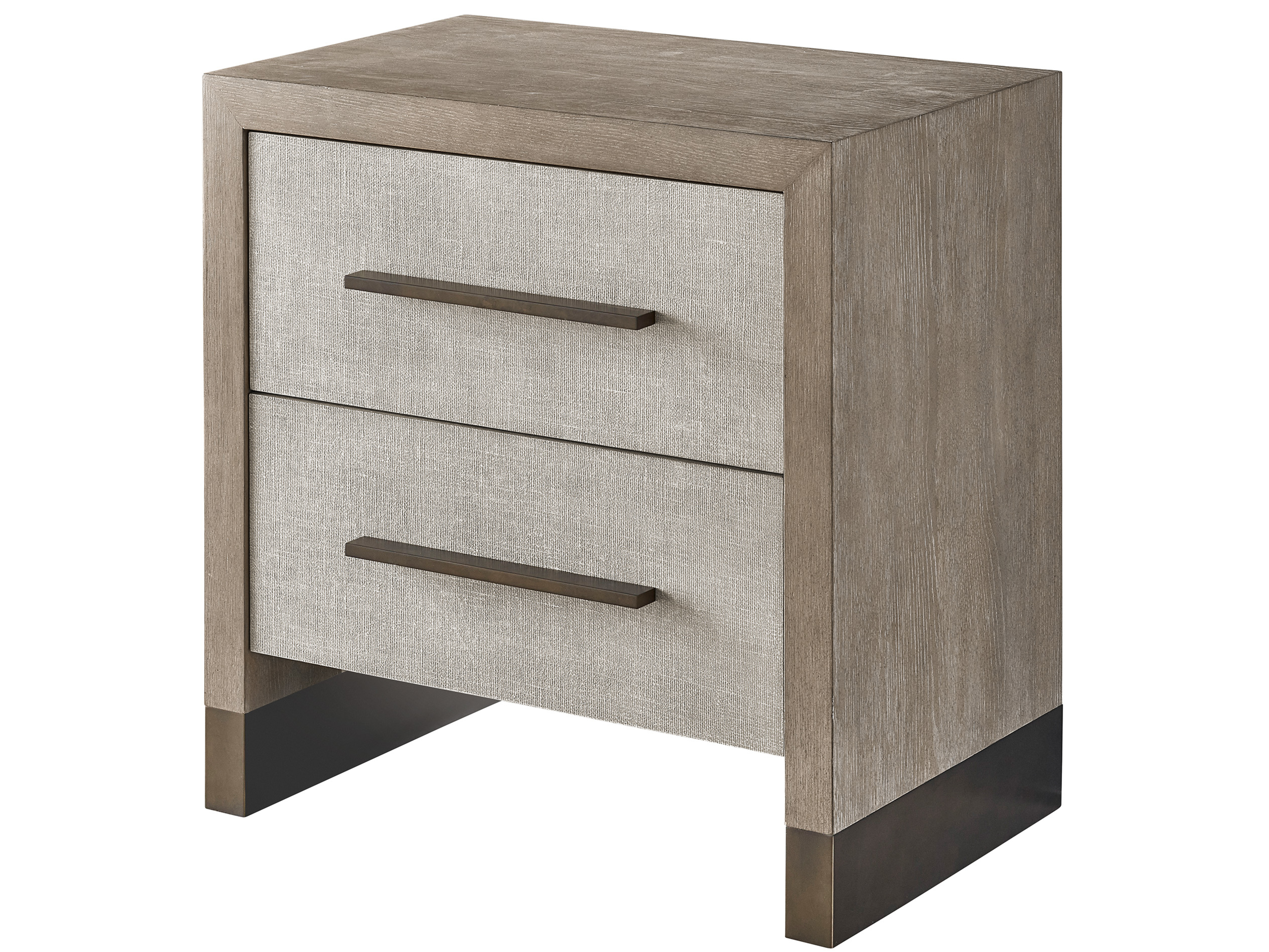 A weathered oak Finish: is embellished with light textured faux linen drawer fronts.