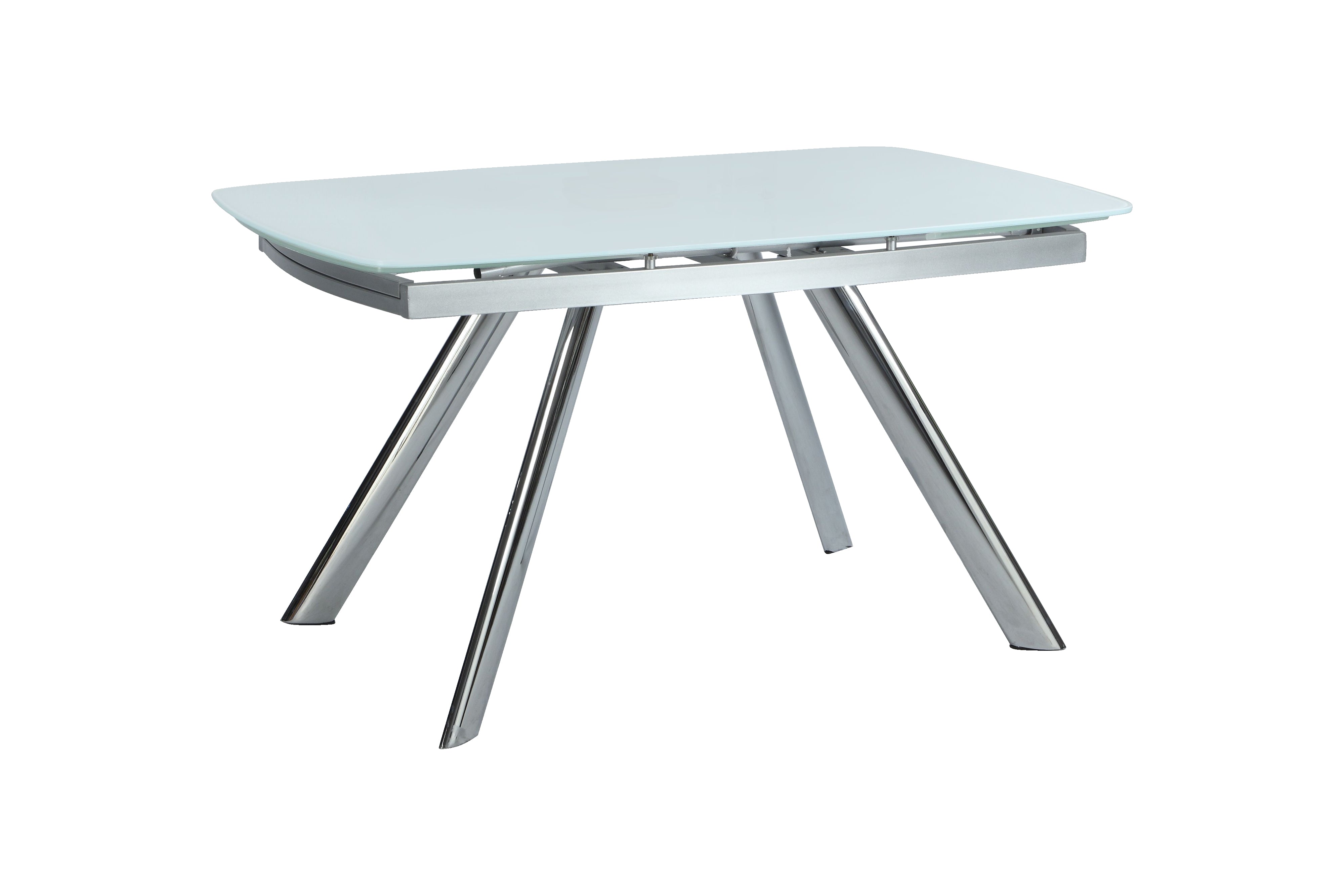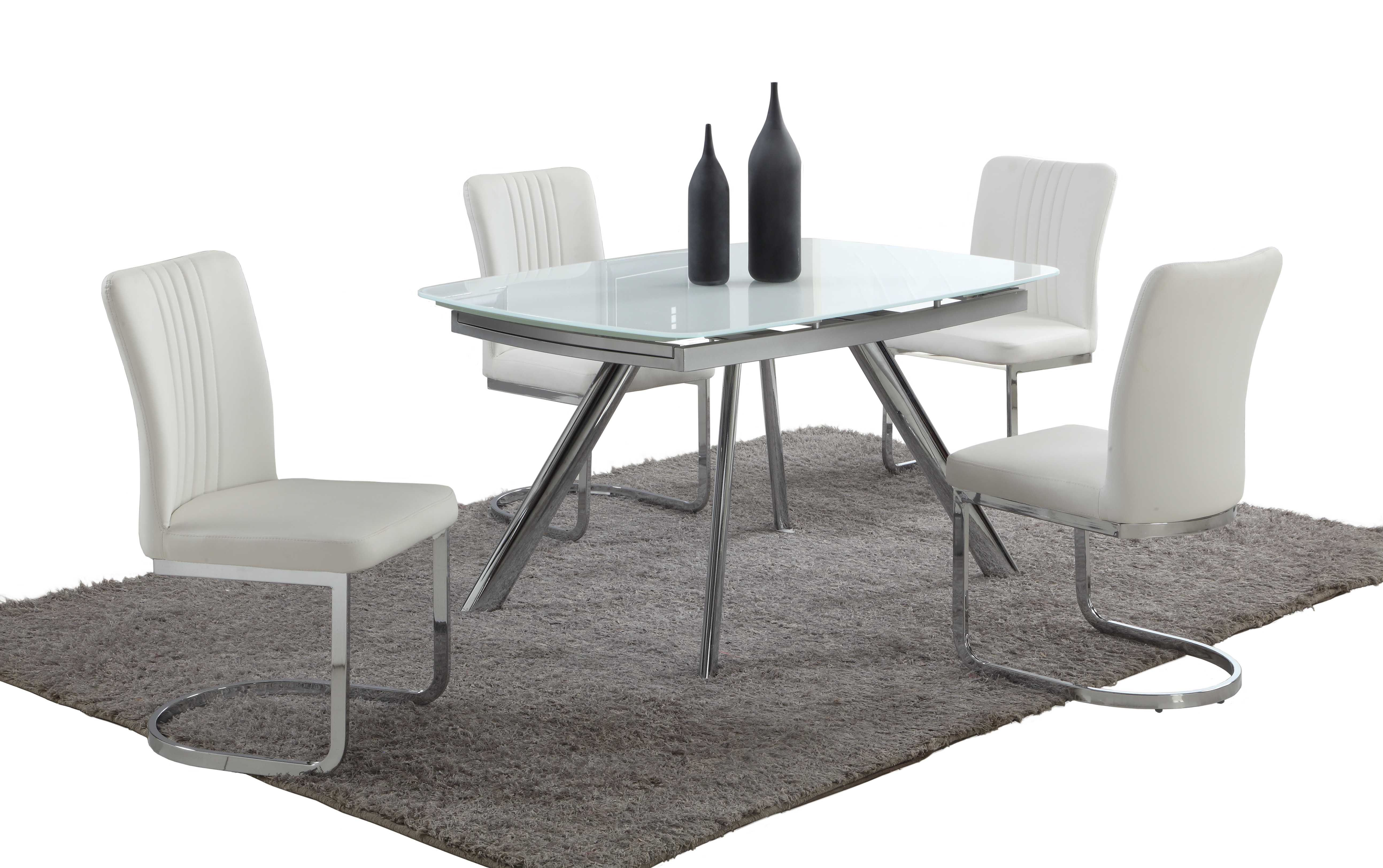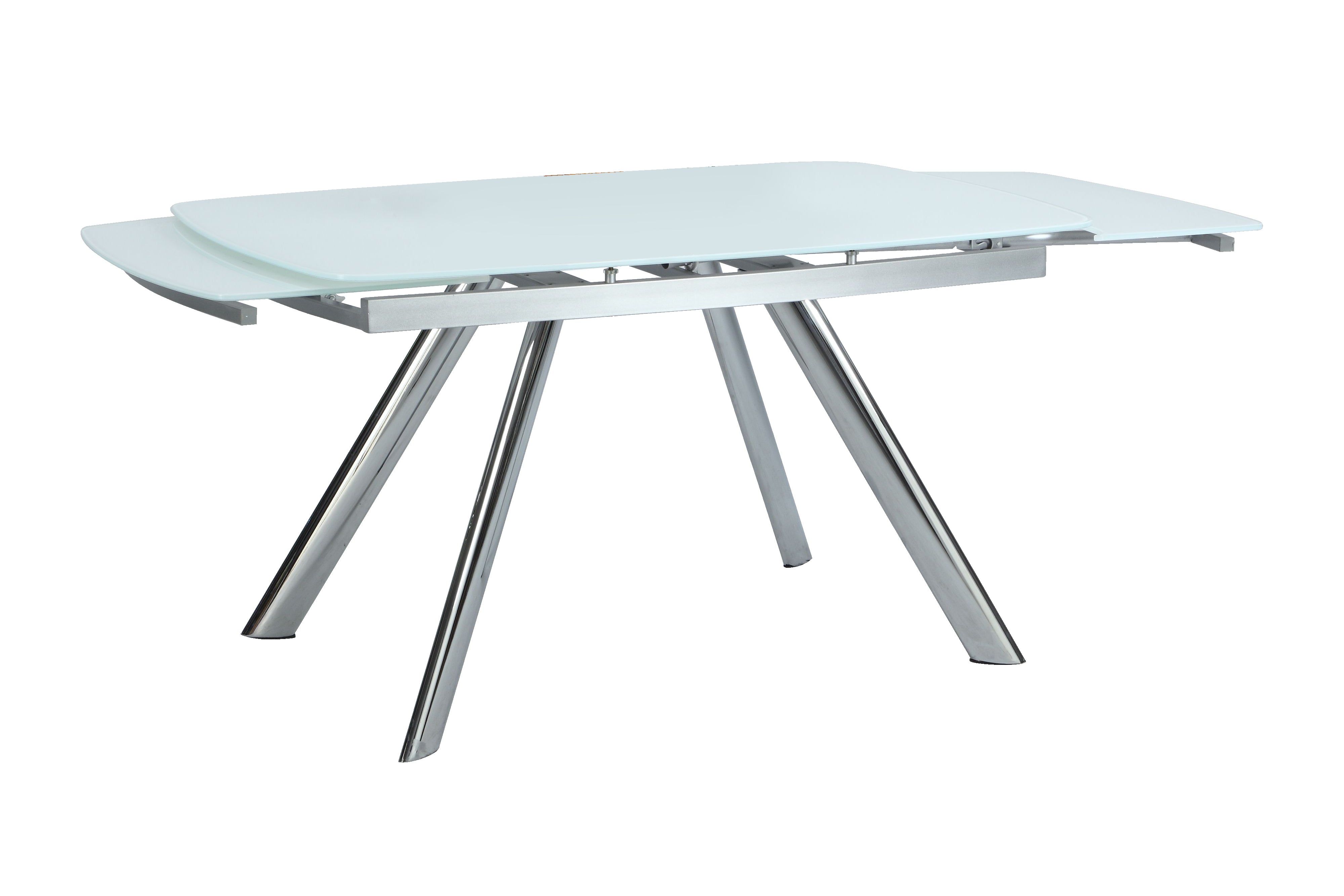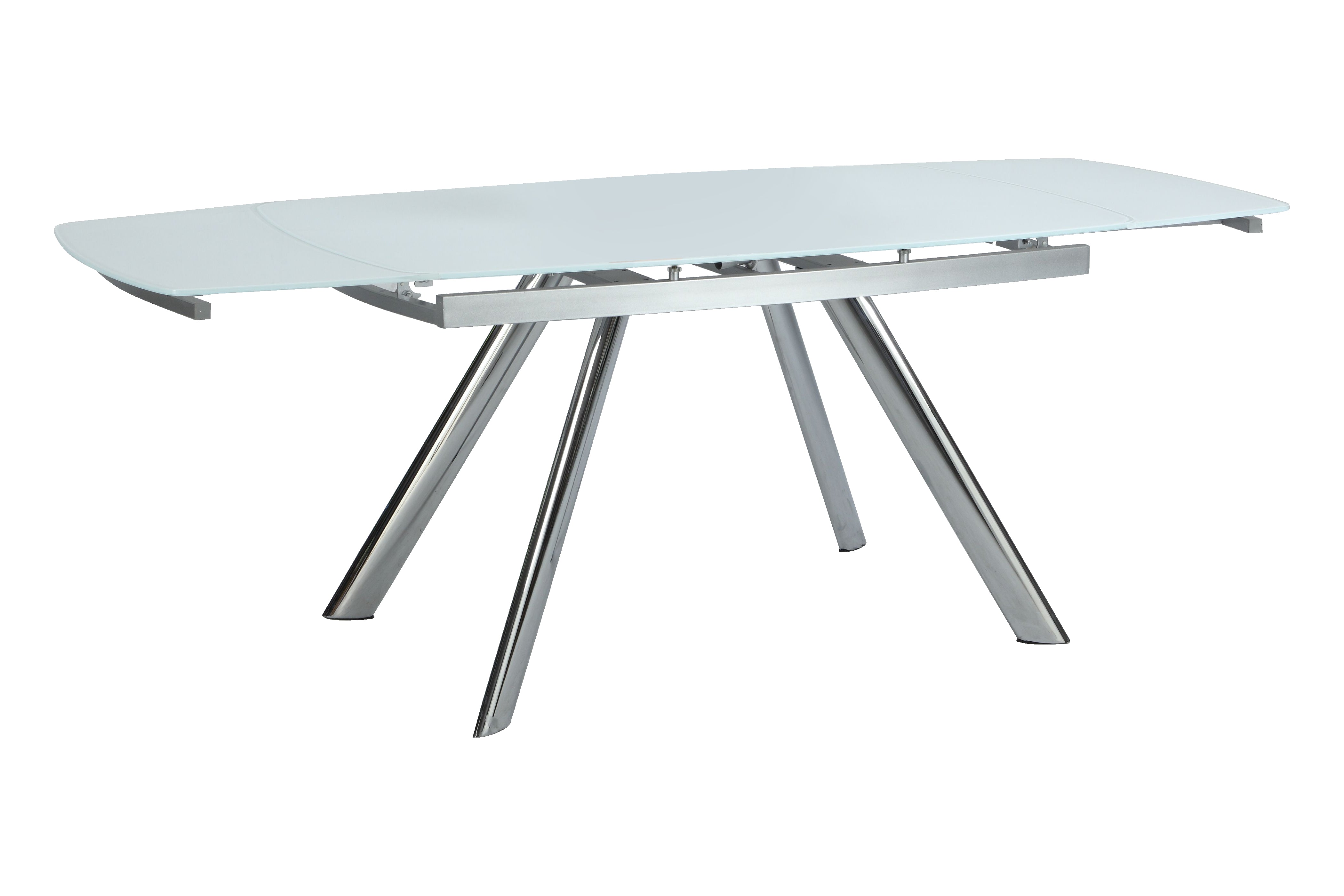 This sophisticated motion extension dining table is a great addition to any dining area. The contemporary style table features a flawless, super white, staphire glass top with extensions on both ends. The chrome finished legs are pointed outward for a pyramid design.