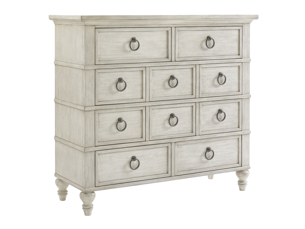 Decorative ring pulls, turned feet and ten drawers create a stylish, yet functional dresser. Today's casual transitional styling blends lighter wood tones, natural textures and relaxed shades of ivory, taupe and gray, with designs that embody a feeling of laid-back sophistication. Oyster Bay offers a casual, comfortable and understated interpretation of lux living. Designs feature an eclectic mix of traditional elements like button-tufting, breakfront profiles and turned legs with more transitional features like geometric metal bases, burnished stainless steel tops and natural materials like rush seats and water hyacinth frames.