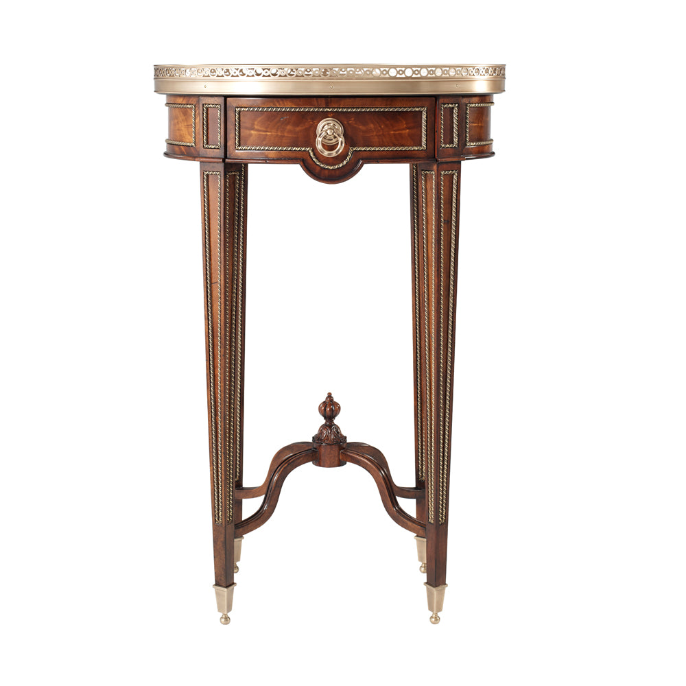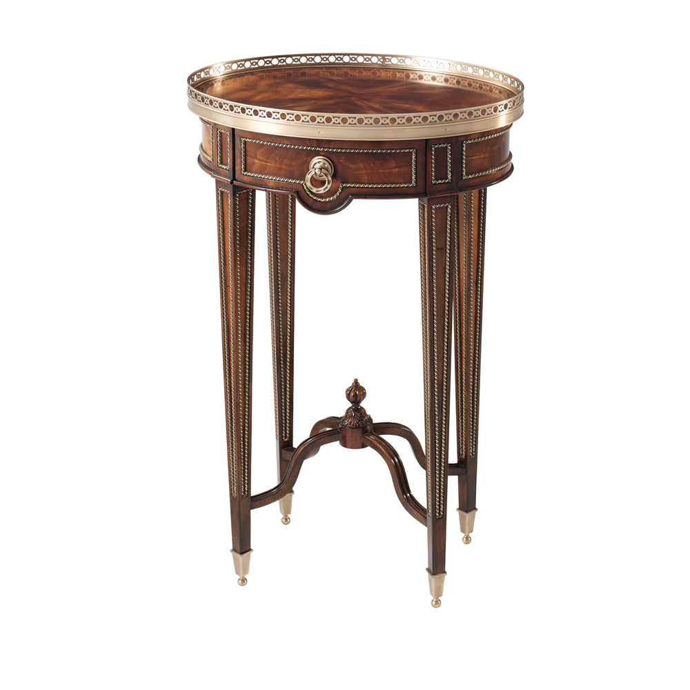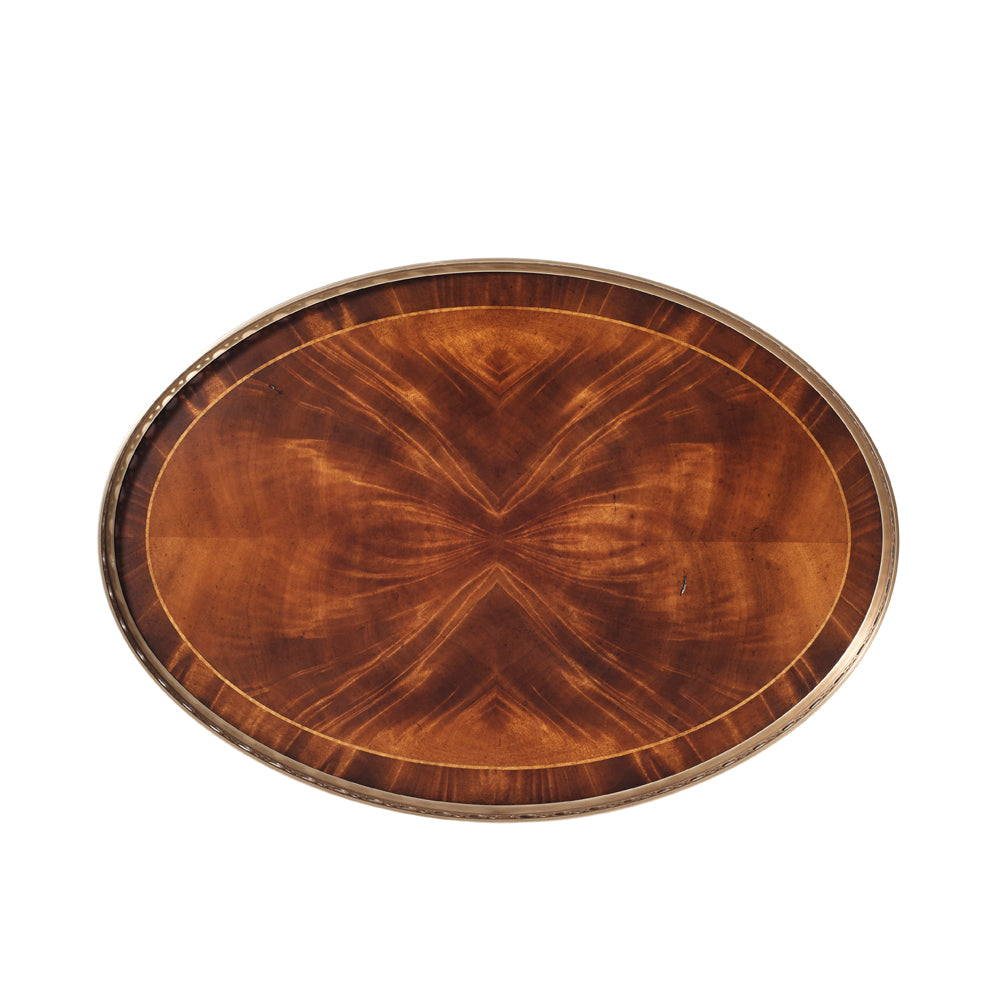 A mahogany and flame veneered lamp table with fine brass mounts, the brass galleried oval top above a frieze drawer on panelled square tapering legs with brass cappings joined by an 'X' stretcher.