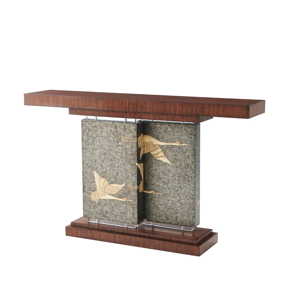 A Hyedua veneered console table, the rectangular top supported by two offset pewter Argento panels painted with flying cranes and with acrylic bases and capitals, on a stepped plinth base.
