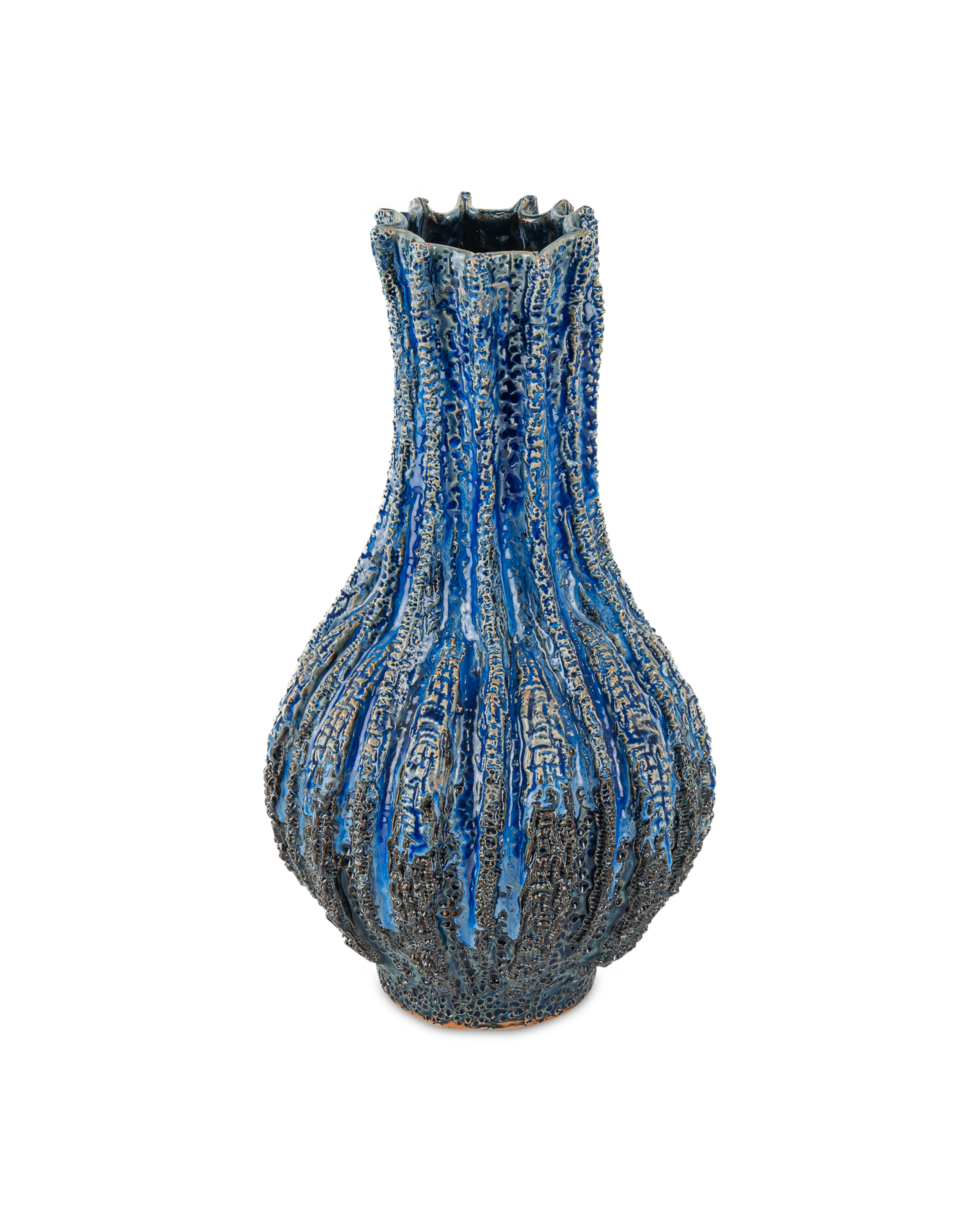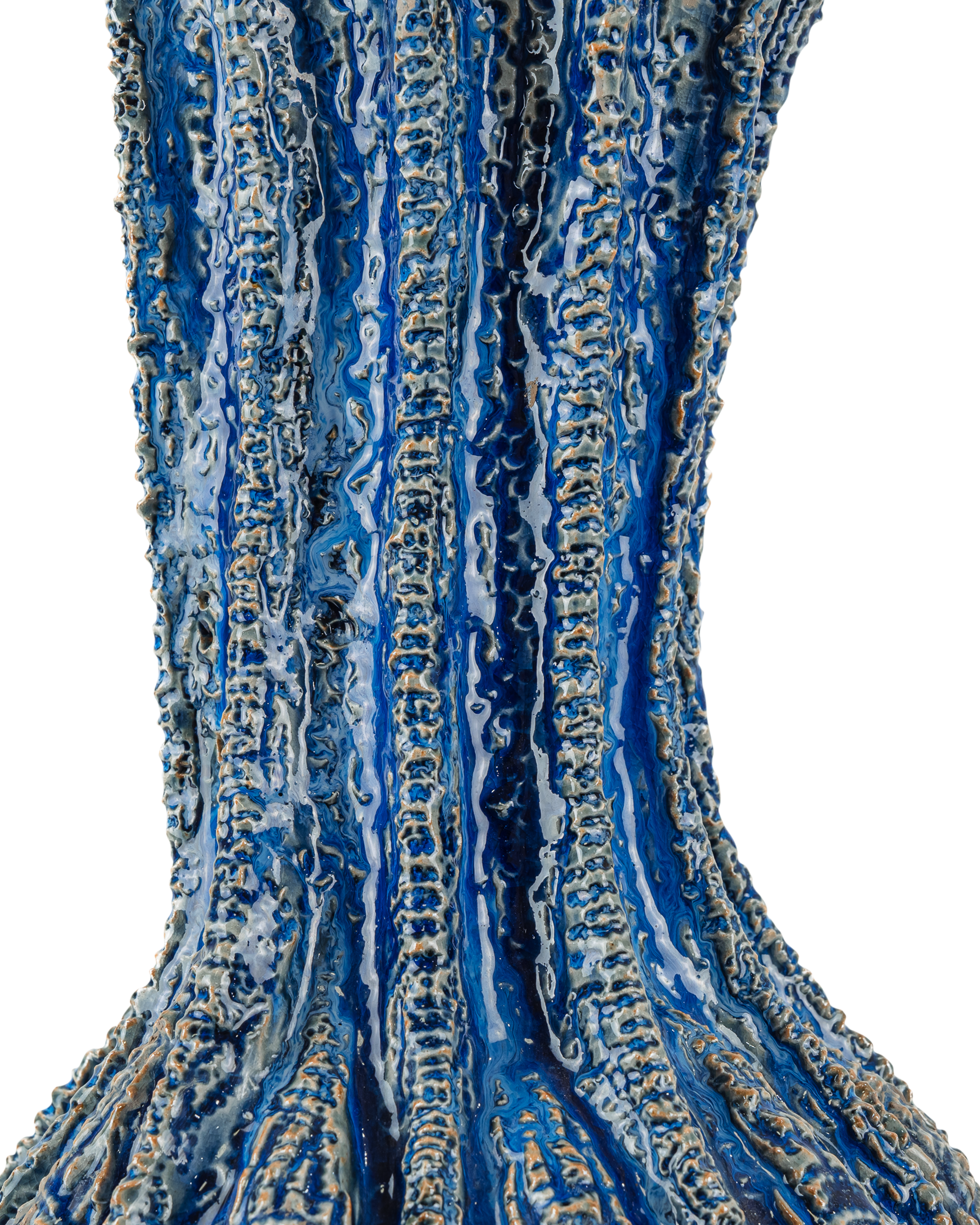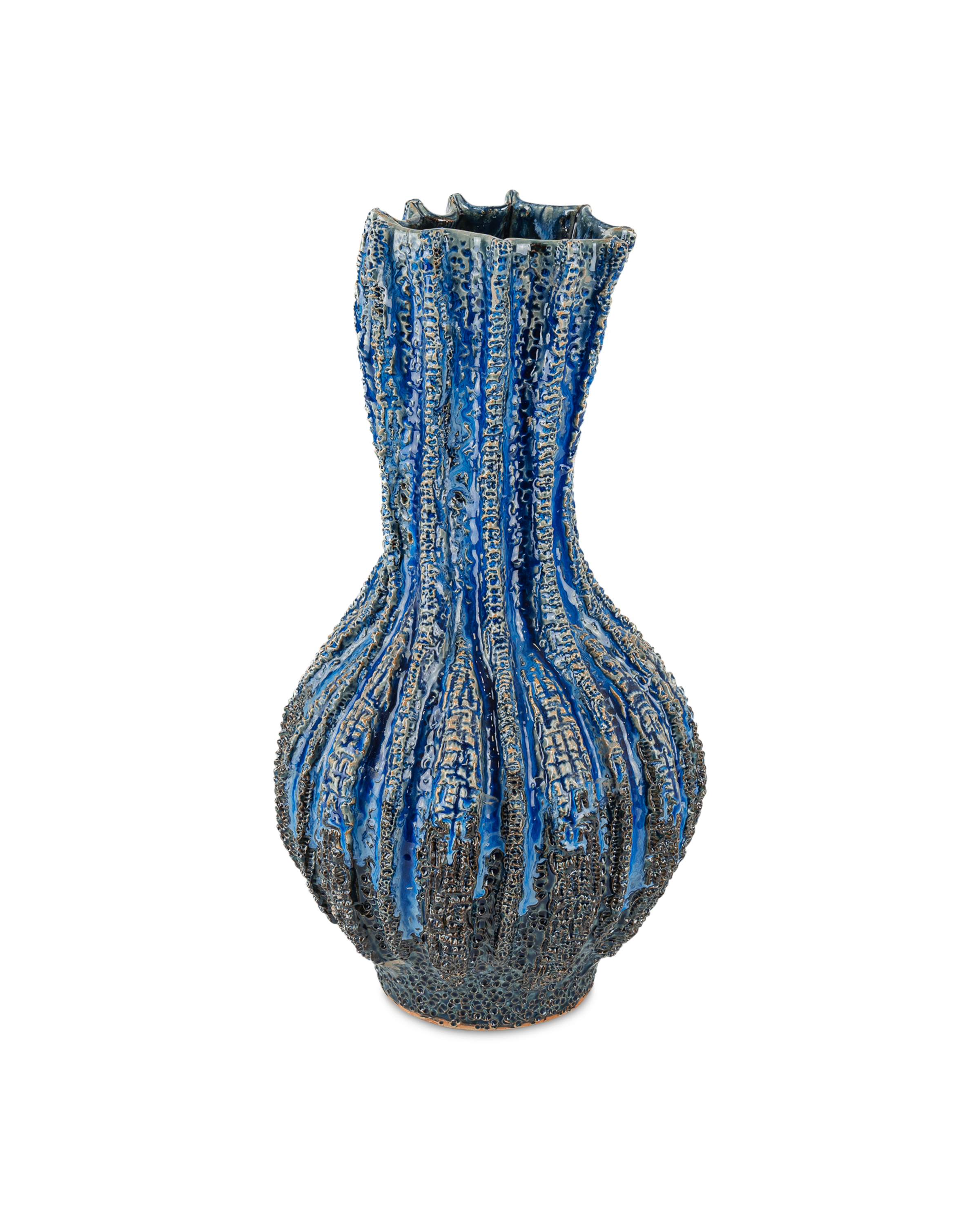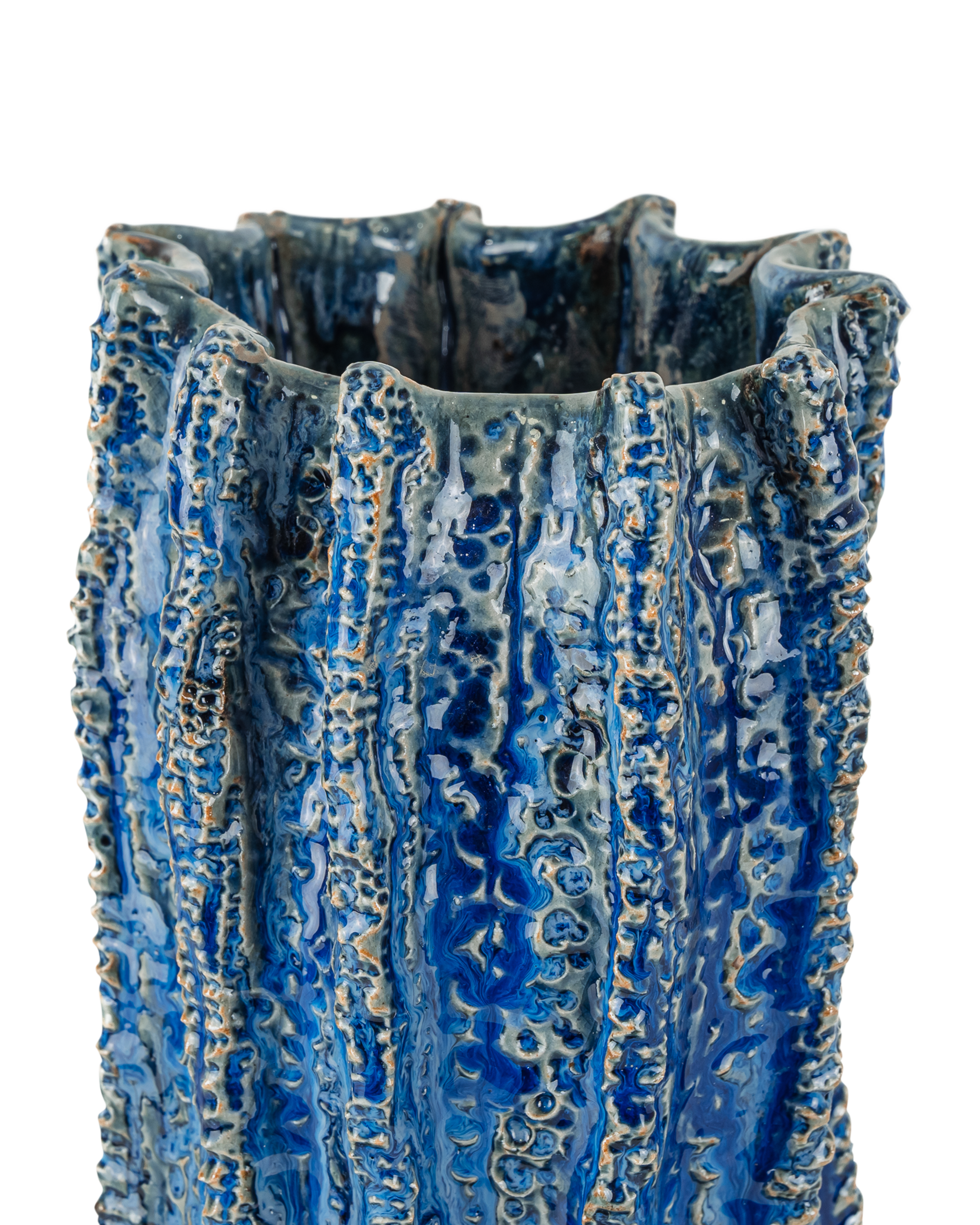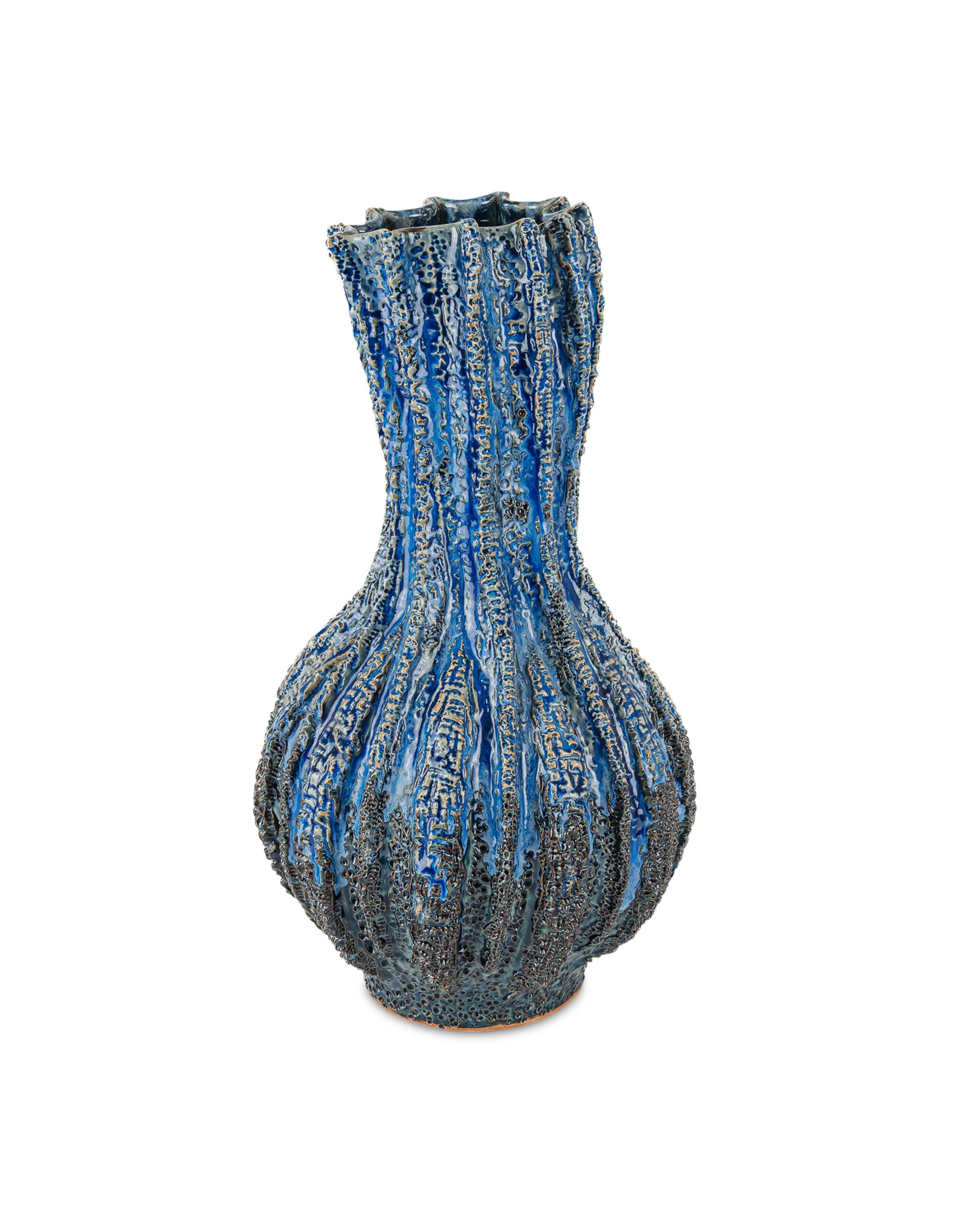 The Folio Vase is crafted from dark clay ceramic, featuring hand-pressed indentations and raised, nubby surfaces. Its organic shape is meticulously thrown and carved before being coated in a rich dark blue reactive glaze. A lighter blue falling glaze highlights the valleys, adding depth and texture that make each vase uniquely captivating.
