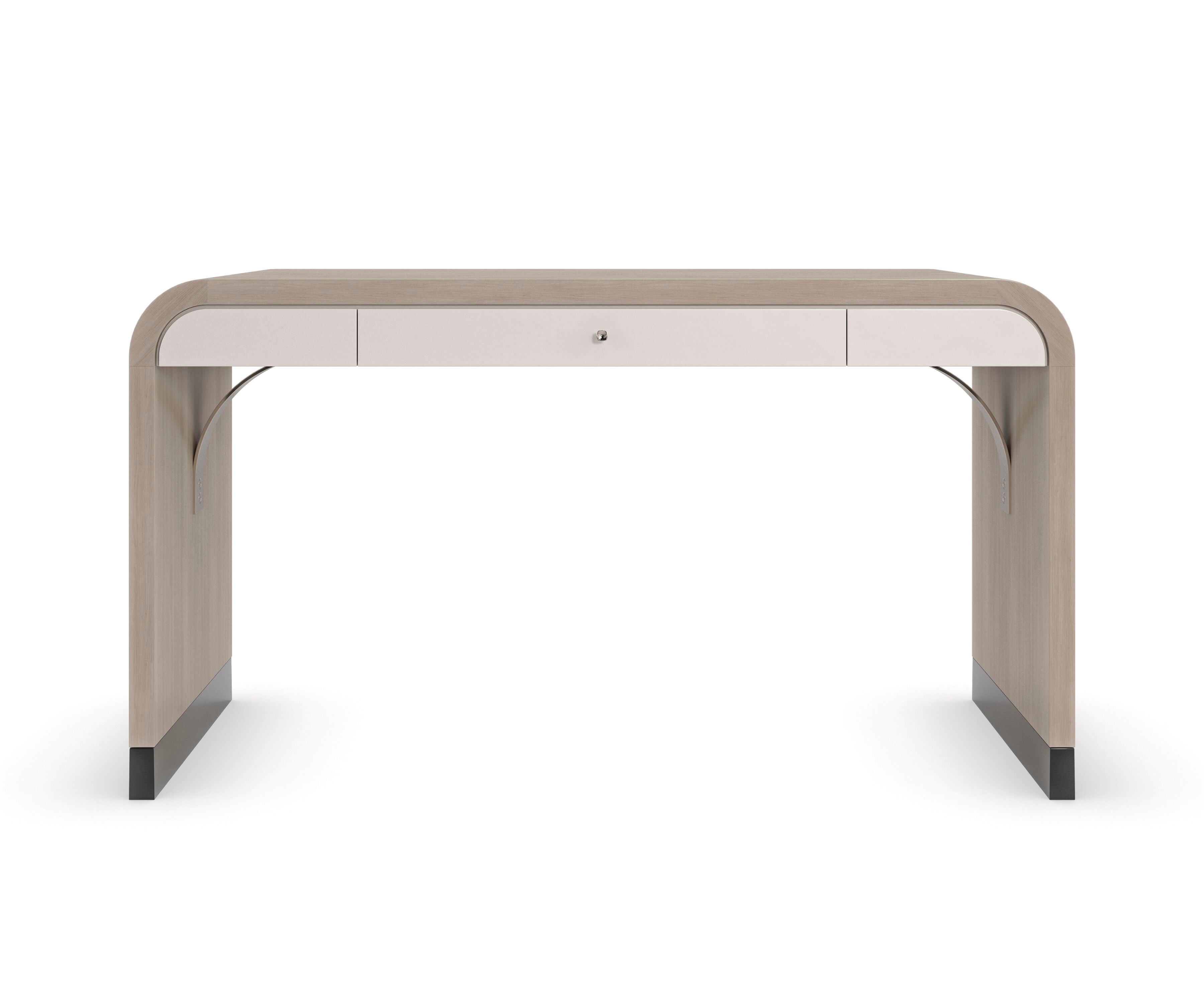 Create a serene space for work and moments of reflection with this parsons style desk, engaging the senses with its fluid form and gently rounded edges. A pearlescent Moonstone finish gives light to the exquisite waterfall herringbone pattern of Koto veneers, complemented by a Pearly White drawer with a center divider inside and painted wood tray. Also works beautifully as a console in halls and entryways, or as an elegant vanity in bedrooms and dressing areas.