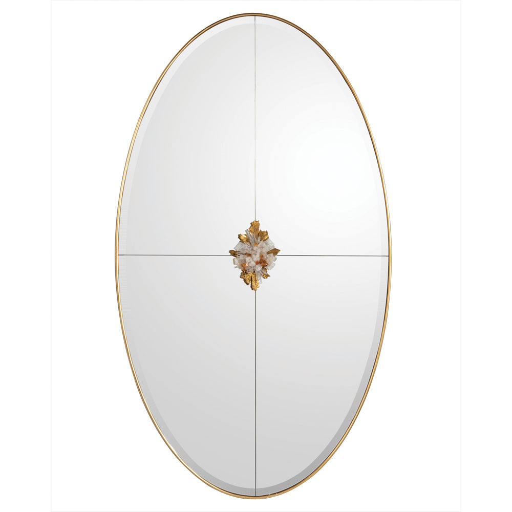 A simple cock bead molding in exotic gold frames the quadrants of bevelled modern mirror. A central decor of selenite crystal completes. Steel hangers provided. Hangs in portrait only.