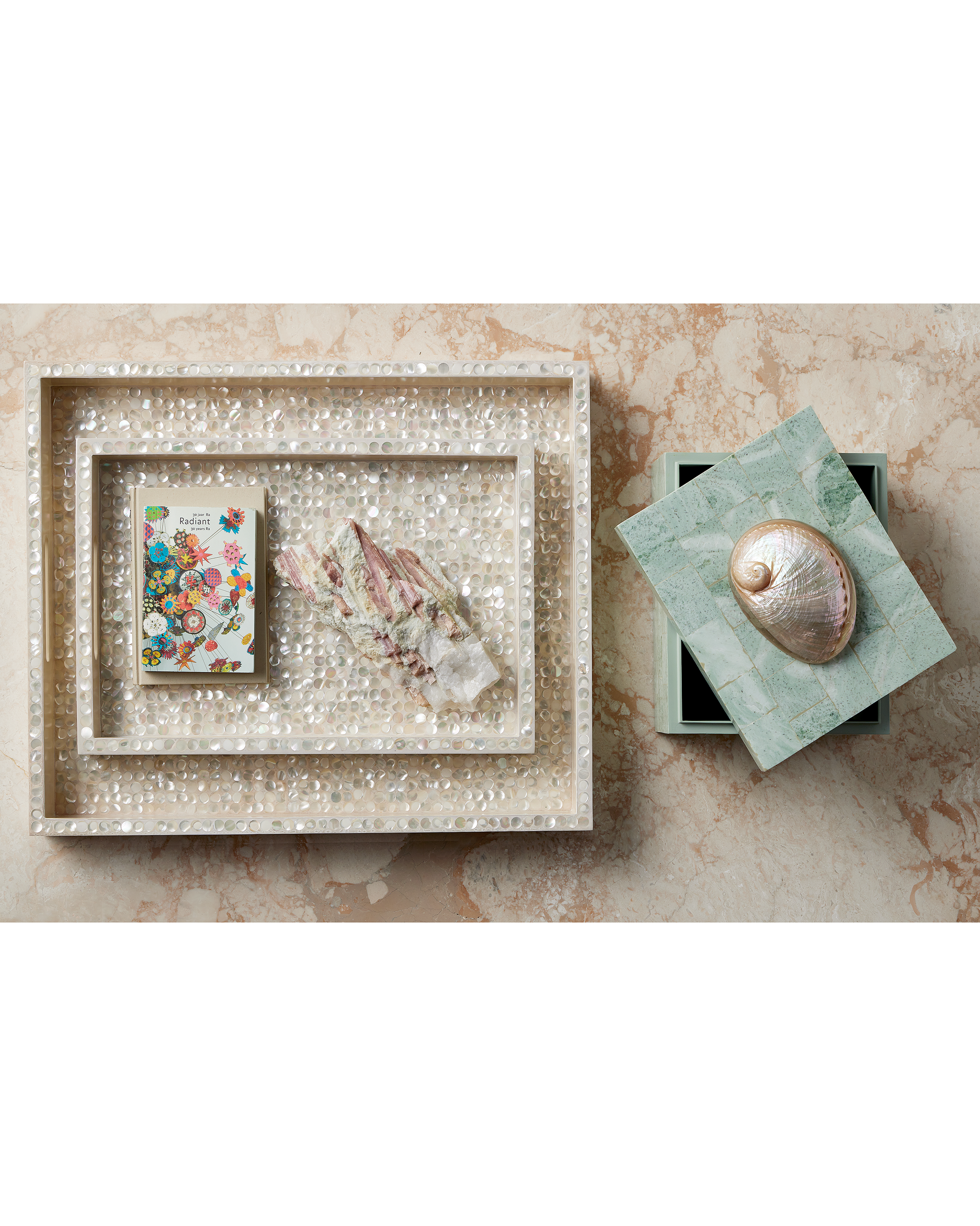 The timeless elegance of mother-of-pearl make the Gerri Dot Tray Set a stunning embodiment of masterful artisanship. Clad in the lustrous material, this set includes both a larger and smaller decorative tray, each reflecting light beautifully and adding a touch of sophistication. Perfect for serving, organizing, or displaying cherished items, these trays elevate any setting with their radiant charm and lasting appeal.