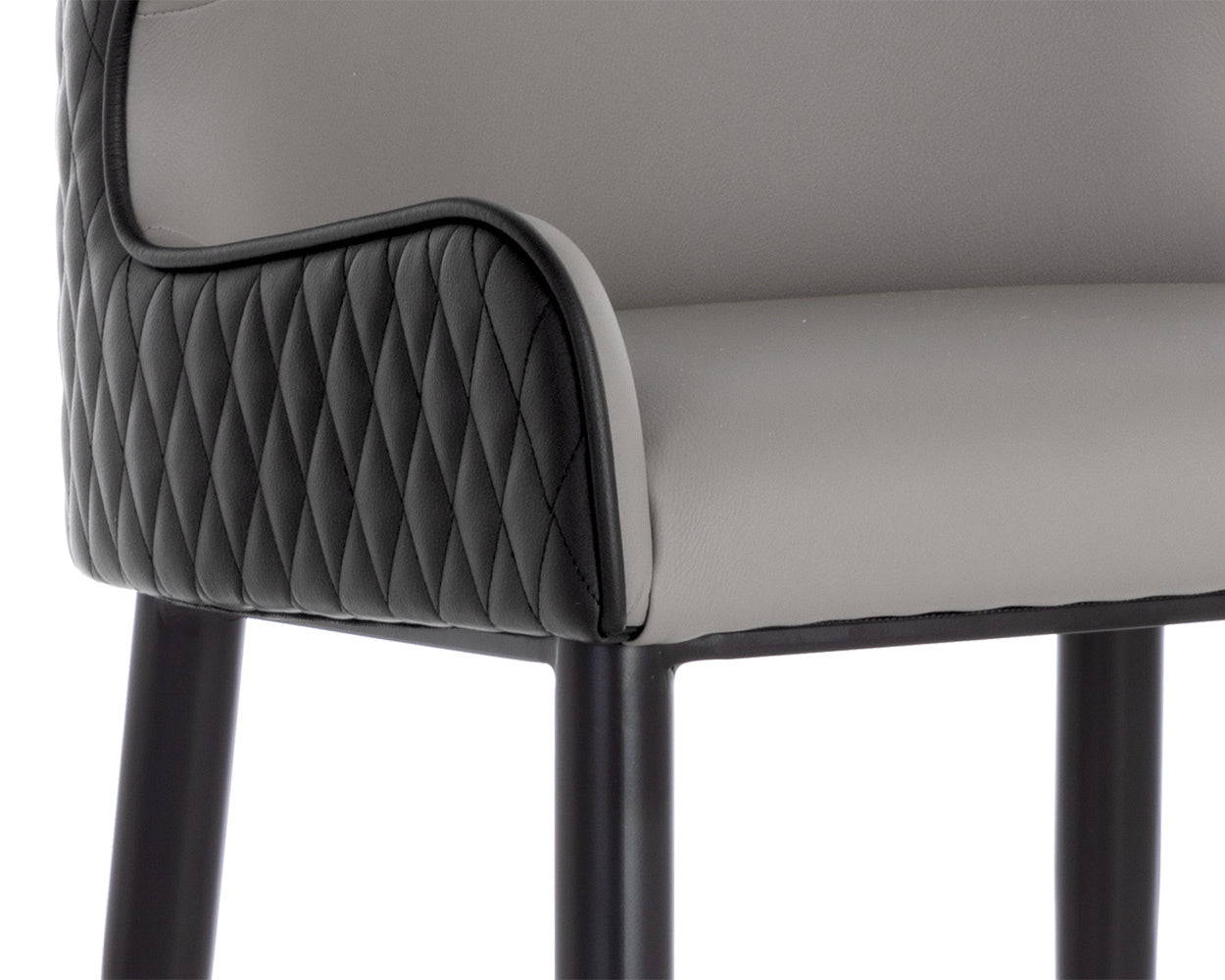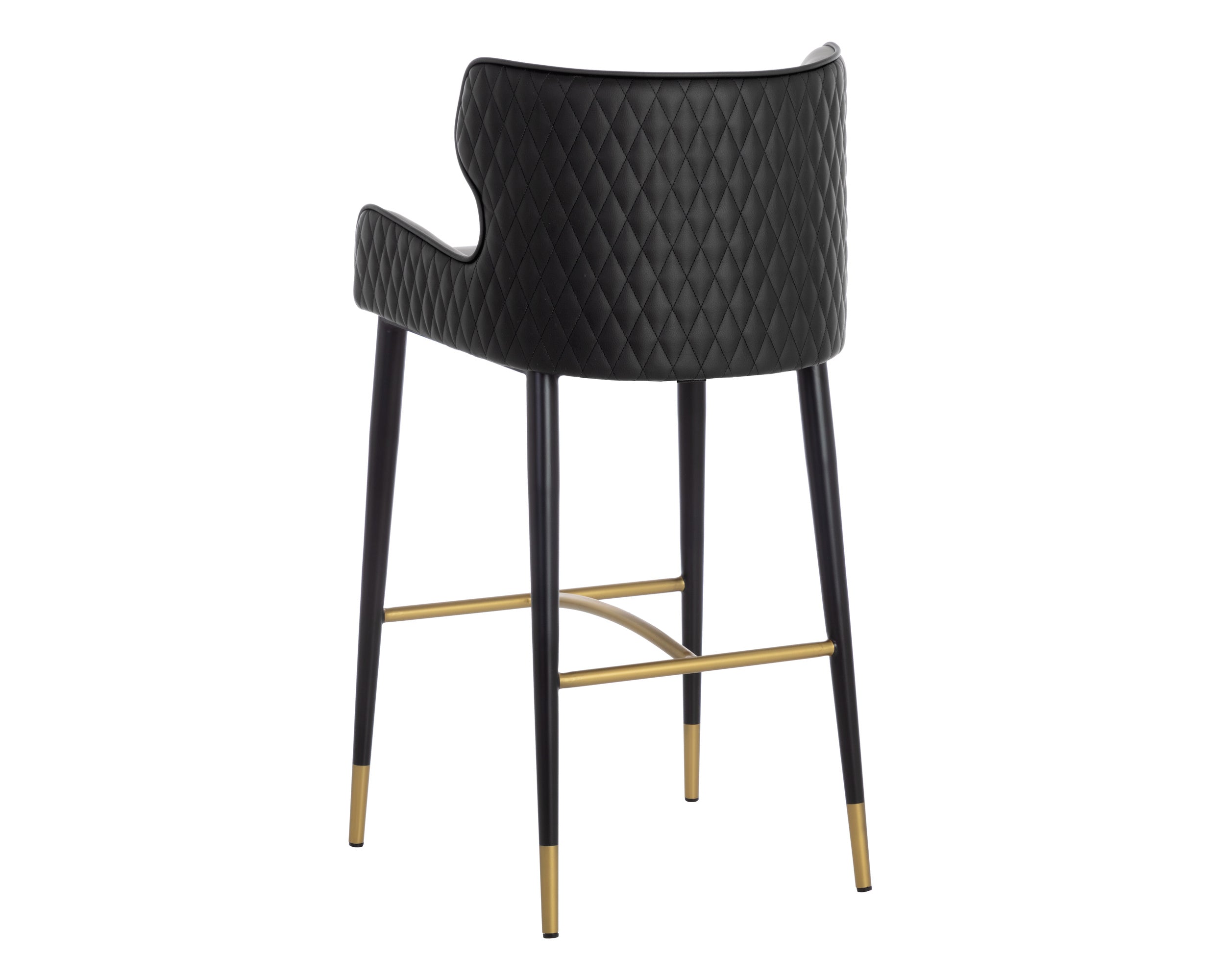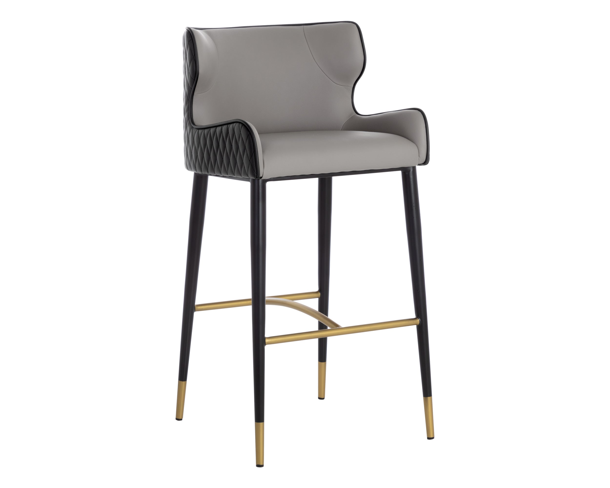 A classic barstool featuring a substantial seat upholstered in contrasting dillon stratus and black faux leather. Diamond stitching on the seatback adds a hint of elegance while black wood legs and brushed gold foot caps complete the look. Handle With Care: This design has been crafted with faux leather. Faux leather is manufactured to reflect the natural characteristics of leather; as such, colour variations, markings, wrinkles, grooves, and light scratches are appreciated characteristics. No two pieces will be alike. Visit our Product Care page for more information on how to ensure the lasting beauty of this piece.