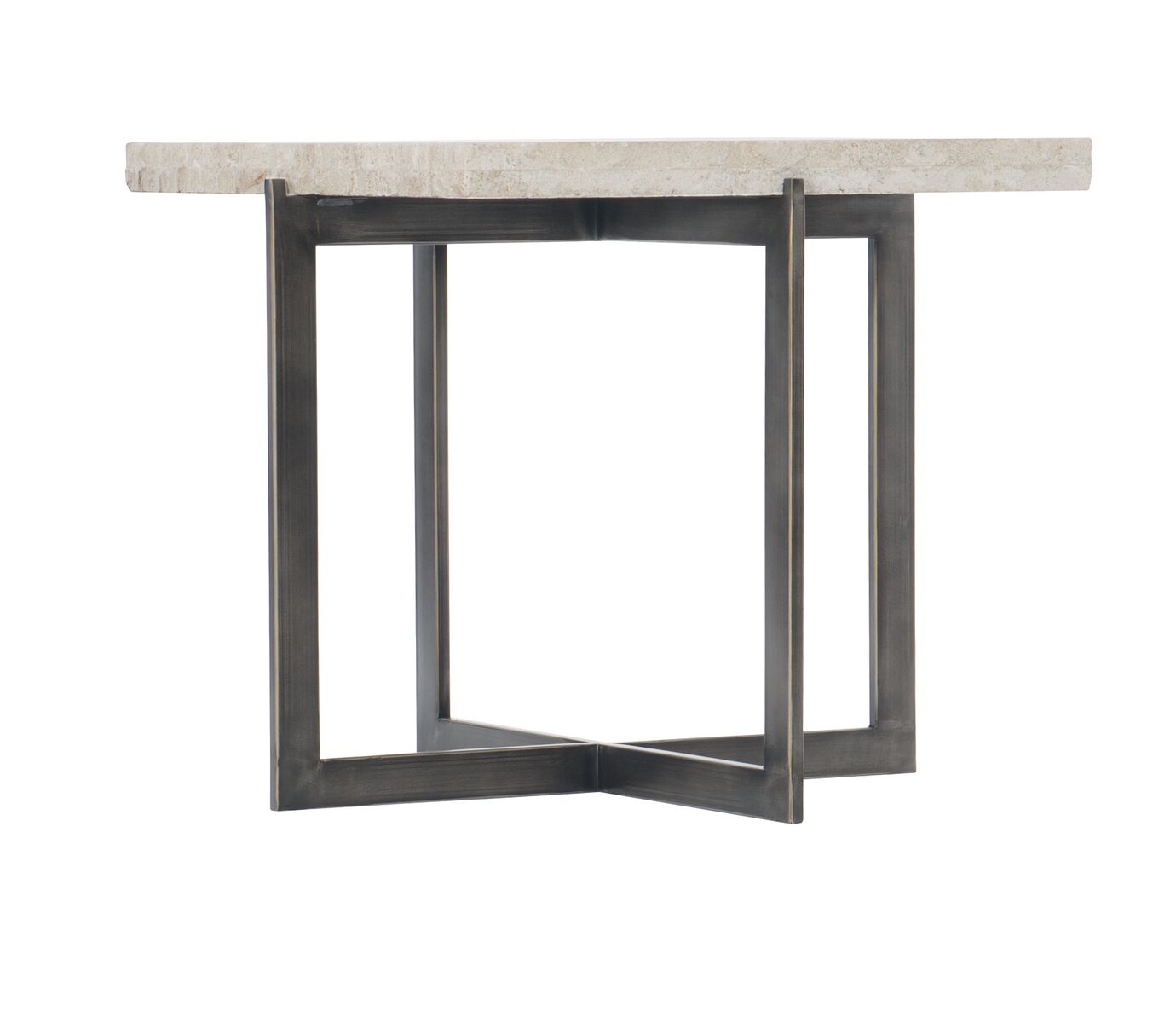 Bernhardt Occasional offers upscale designs for luxe living spaces. The Hathaway console table presents contemporary style with geometric leanings. With origins in mid-century design, the sleek tubular steel base provides structural stability and clean, bold lines. An oil-rubbed bronze finish on the base creates an engaging contrast with the white travertine stone top, which features a chiseled edge.