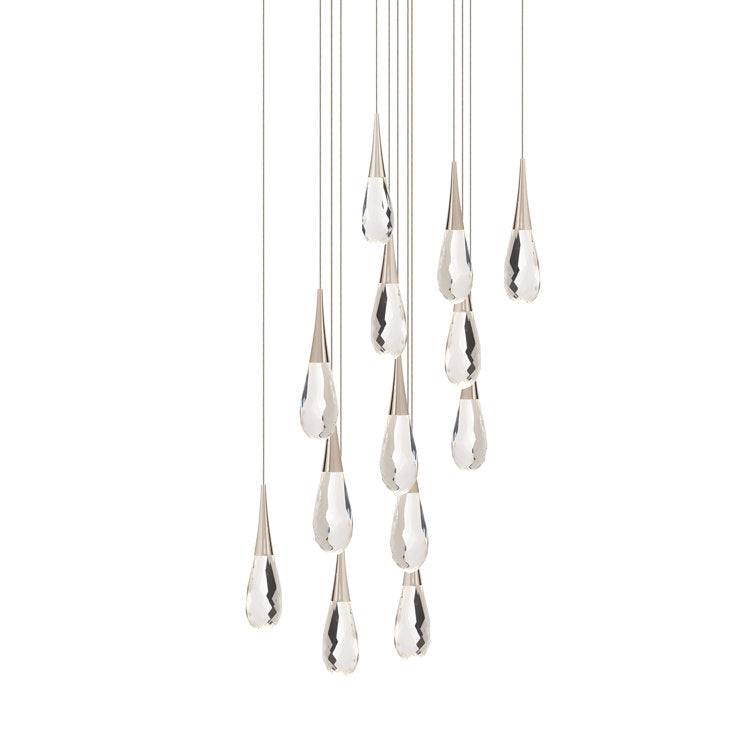 Multi Lights: Multiple height-adjustable, faceted crystal teardrop elements float in mid-air. Cascading from above and perfectly designed for illuminating foyers and dining tables while making a dramatic design statement in a range of residential and hospitality environments. Mini Pendant: Crystal fashion comes to light in unique forms. Delicate, graceful drops of exquisite crystal embraced by tapered metal forms that glow with a charming lustre. Matching crystal overlays are applied to the metal canopies for an additional touch of luxury.