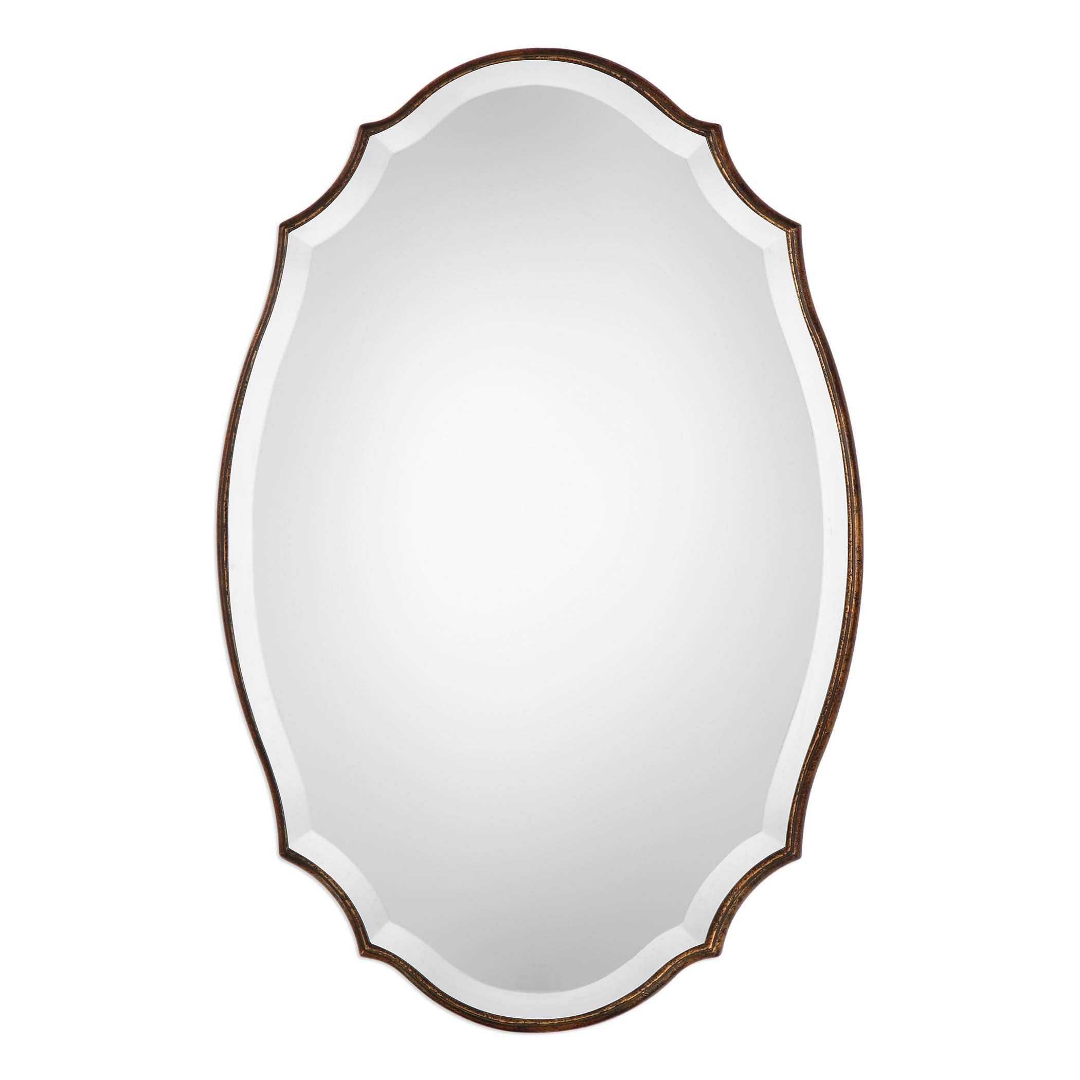 A shaped beveled mirror sits atop a rounded edged frame, finished in an antique bronze and gold finish. The bevel is 1. May be hung either vertically or horizontally. Also available in gold leaf, W00531.