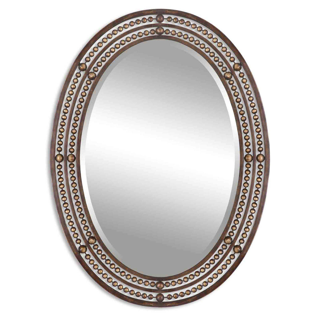 Hand forged metal frame accented with strands of beads, finished in a distressed, oil rubbed bronze with antique gold highlights. The mirror has a 1 bevel. May be hung either vertically or horizontally.