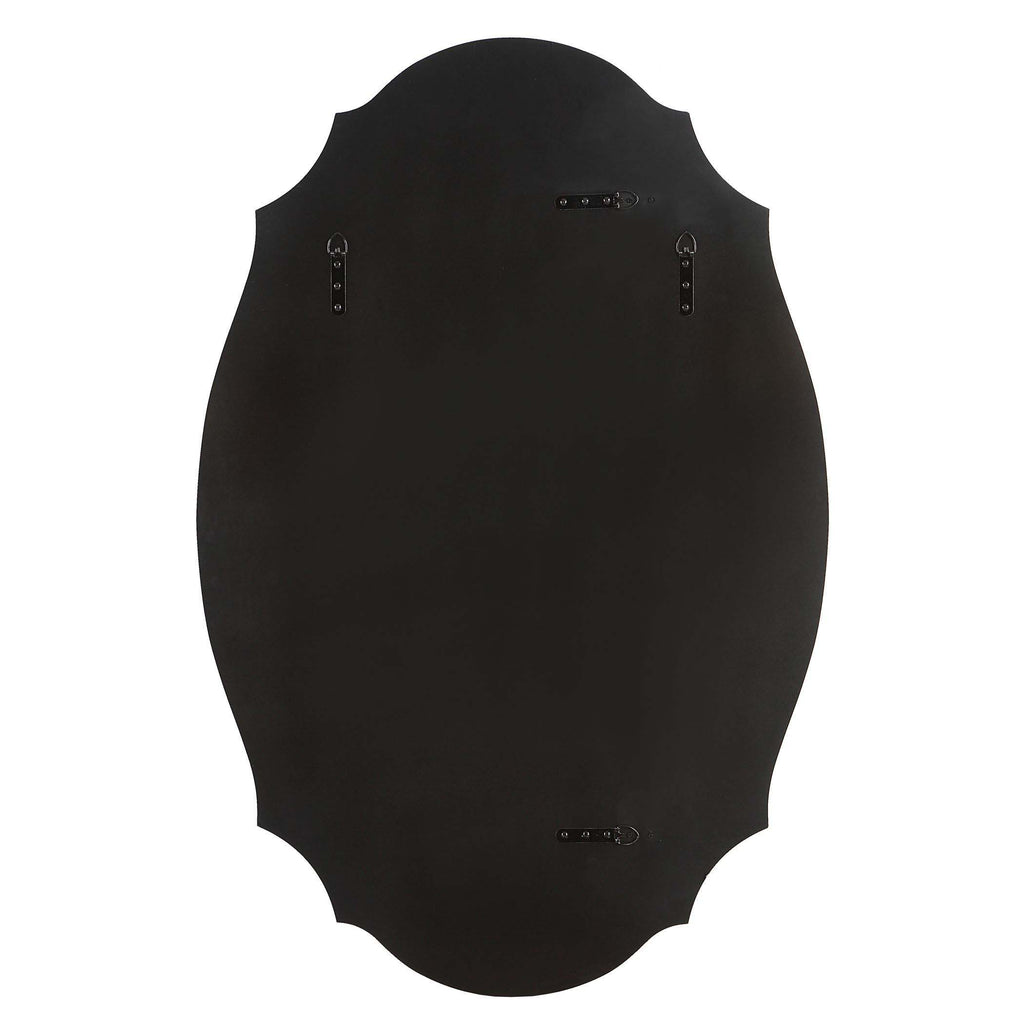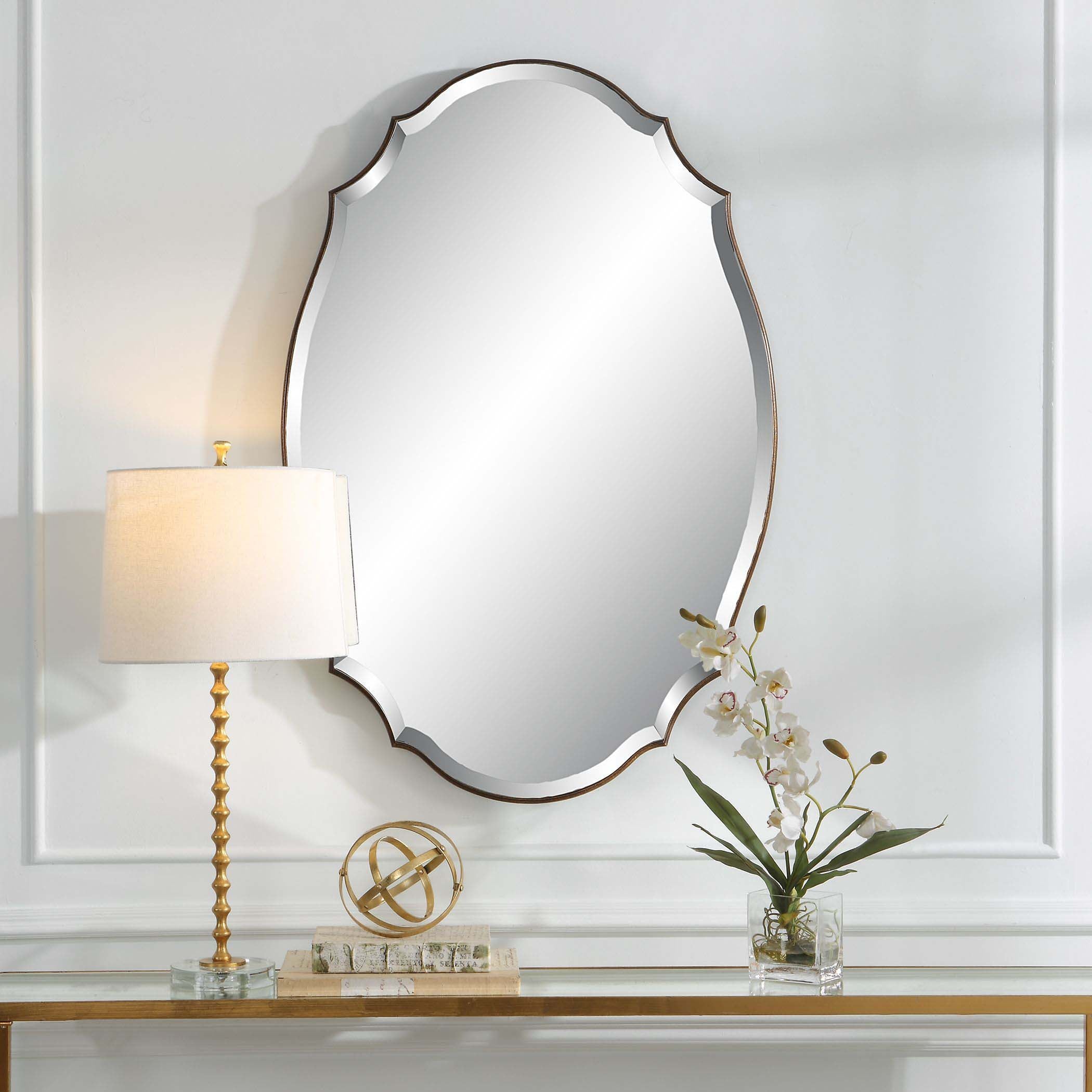 A shaped beveled mirror sits atop a rounded edged frame, finished in an antique bronze and gold finish. The bevel is 1. May be hung either vertically or horizontally. Also available in a 20 x 30, W00406.