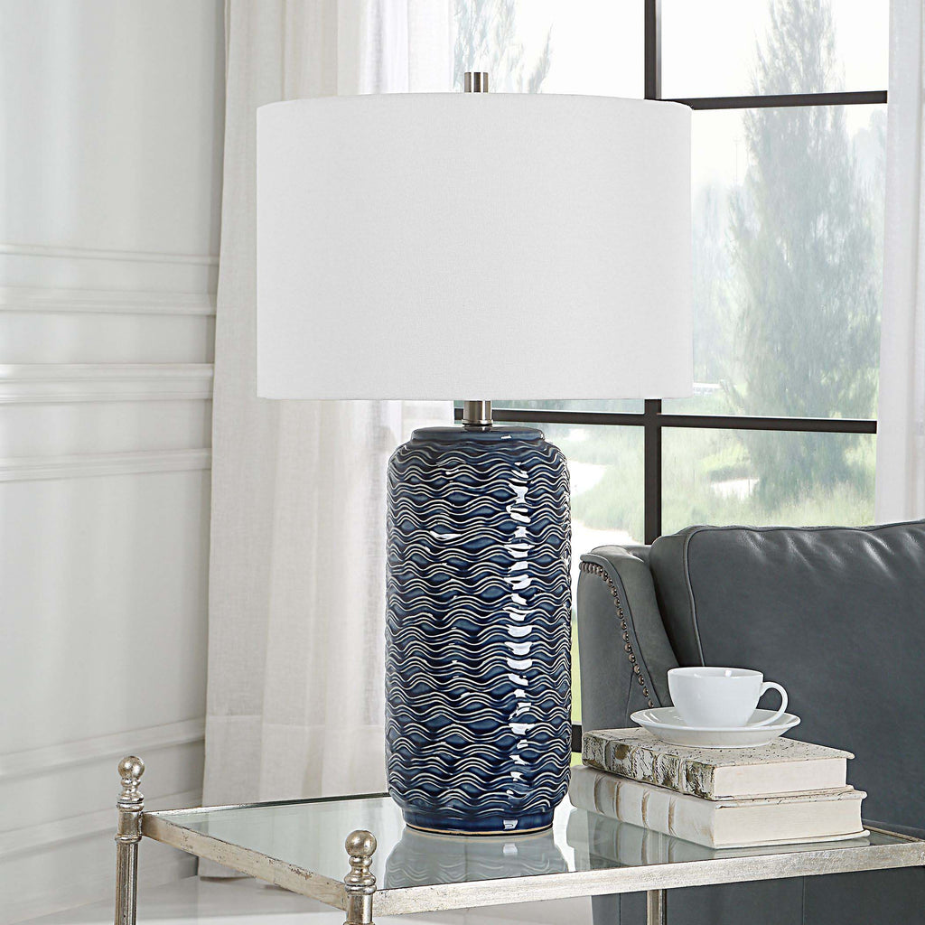 Beautiful blue ceramic table lamp features a wavy texture, accented with brushed nickel. The round hardback shade is a white linen fabric. Also available in white, W26093-1.