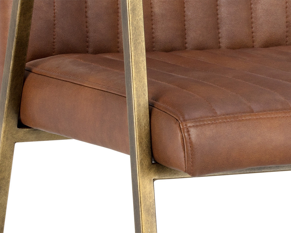 This compact dining armchair from our Ikon collection will bring a sophisticated industrial style to any space. Features bold channel stitching on the seat and seatback and finished with a brushed antique brass frame. Available in bravo cognac faux leather. Handle With Care: This design has been crafted with faux leather. Faux leather is manufactured to reflect the natural characteristics of leather; as such, colour variations, markings, wrinkles, grooves, and light scratches are appreciated characteristics. No two pieces will be alike. Visit our Product Care page for more information on how to ensure the lasting beauty of this piece.