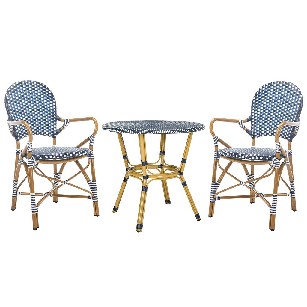 Elevate your outdoor decor with the chic and inviting Rosen 3 Piece Bistro Set, beautifully crafted in a timeless color scheme. Designed for comfort and style, this lovely ensemble includes two elegantly curved chairs and a perfectly sized table, making it an ideal choice for intimate patio conversations, sipping morning coffee, or enjoying a quiet meal under the sun. The woven navy and white patterns add a touch of sophistication, while the sturdy construction ensures you'll enjoy this bistro set in your outdoor spaces for seasons to come. Create your own cozy corner for relaxation or social gatherings and enjoy the blend of functionality and stylish design that this bistro set brings to your home.