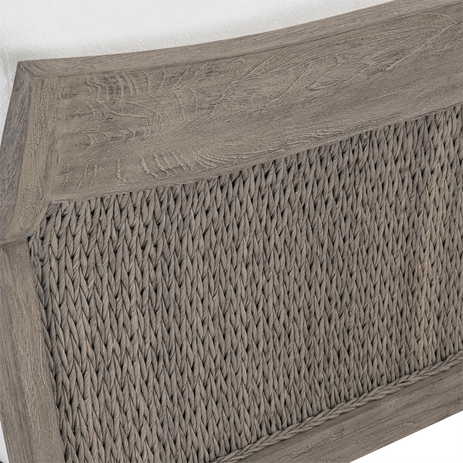 A teak frame sleekly supports deeply comfortable cushions and is highlighted with a unique twisted abaca inset panels along the back.
