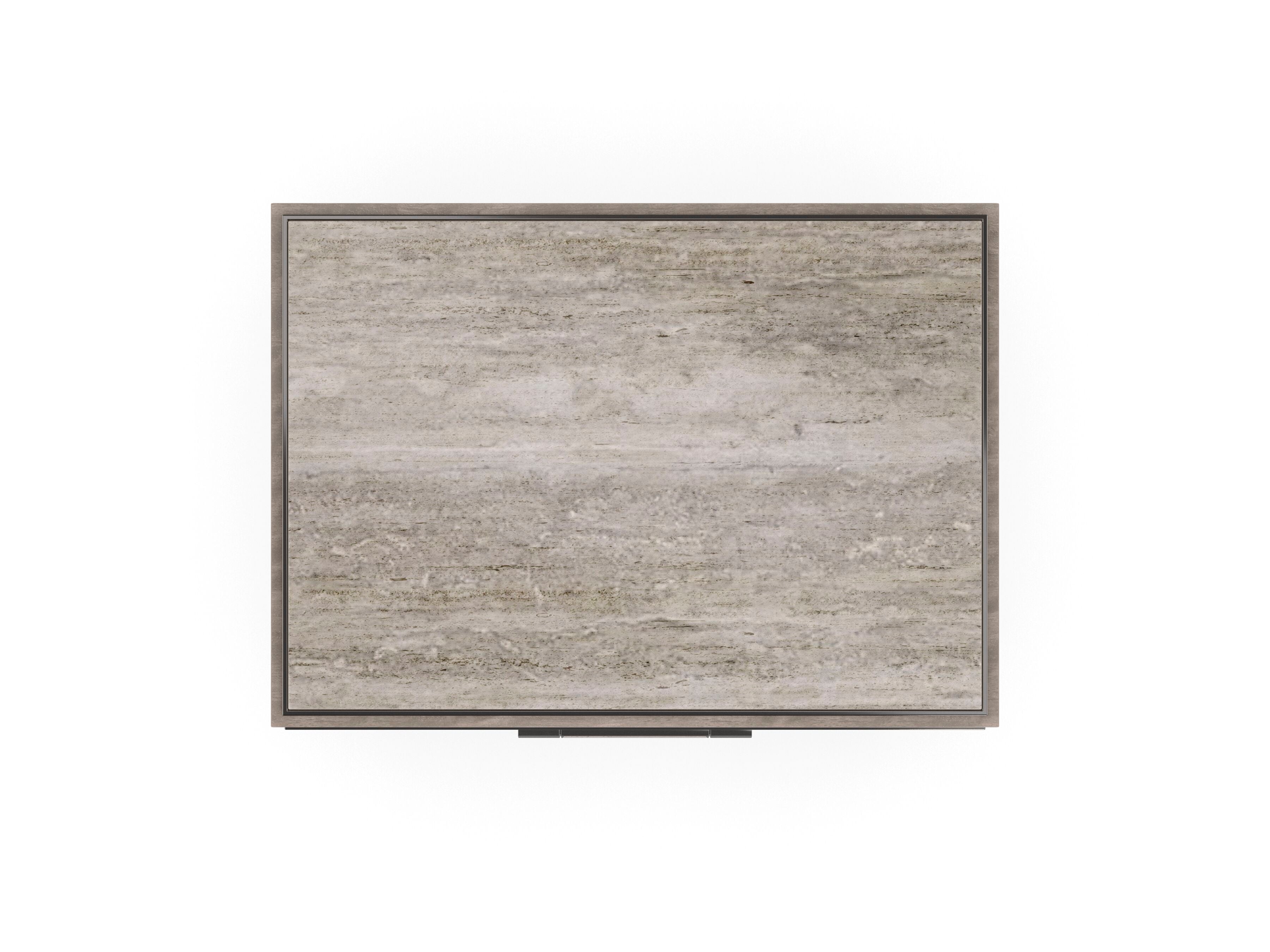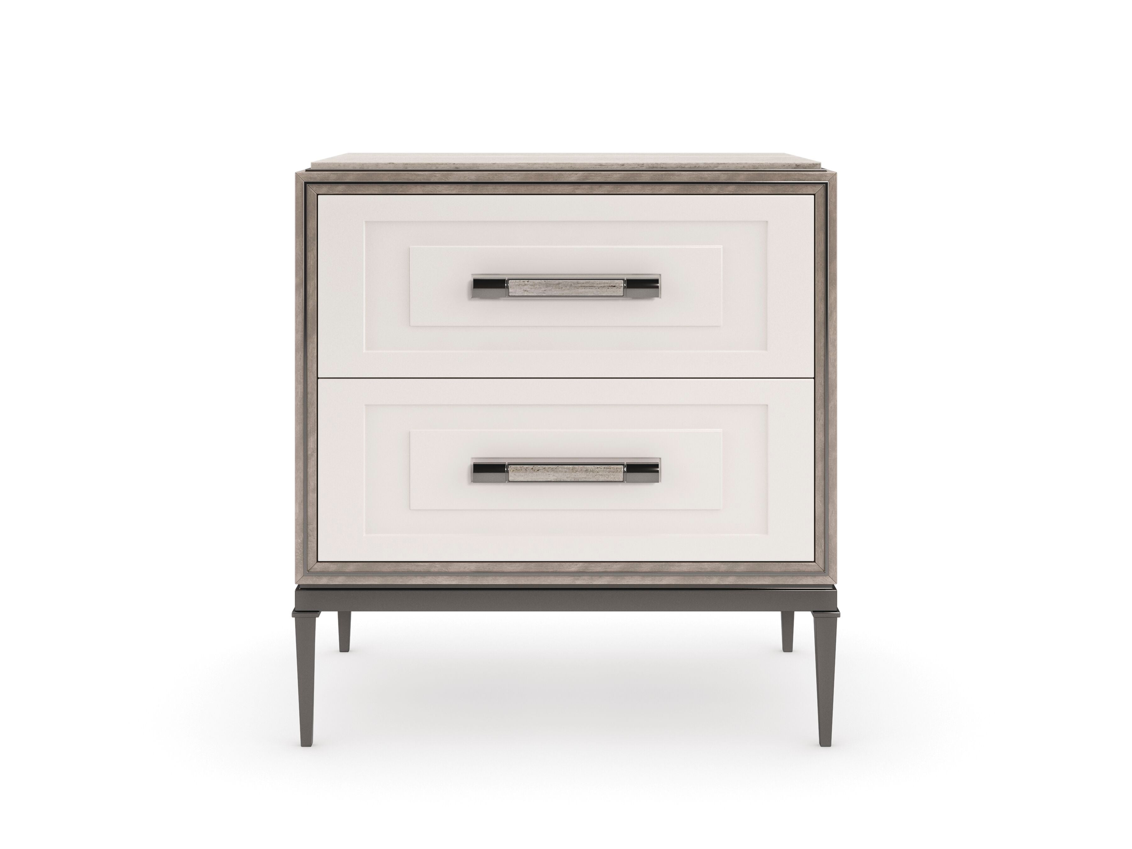 Sophisticated and straightforward, this nightstand artfully mixes organic elements with clean lines and the soft sheen of metal. Custom hardware with a ceramic detail calls attention to the depth and dimension created by stepped drawer fronts in a Pearly White finish. Adding a note of luxe: a Travertine stone top, complemented by the figured wood grain of Silver Curupixa veneers in an earthy Mountain Smoke finish. Designed with two spacious drawers for neatly keeping books and other bedside essentials. Perfectly suited for a casual retreat or stately bedchamber.