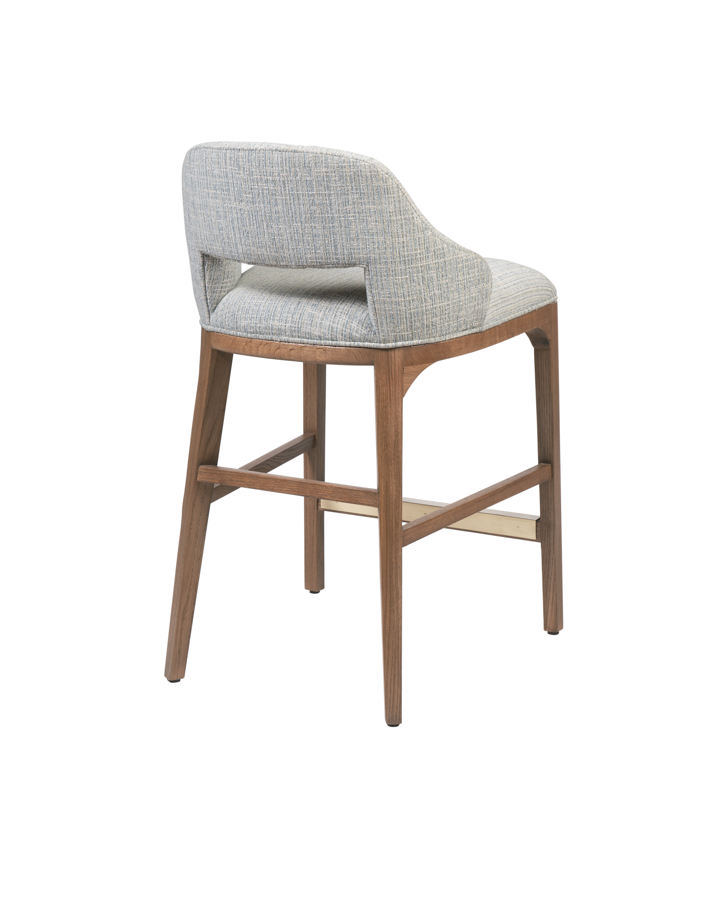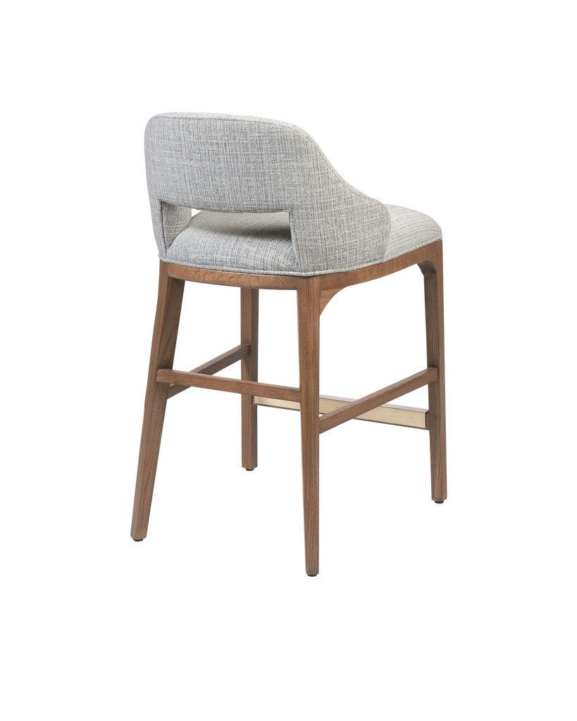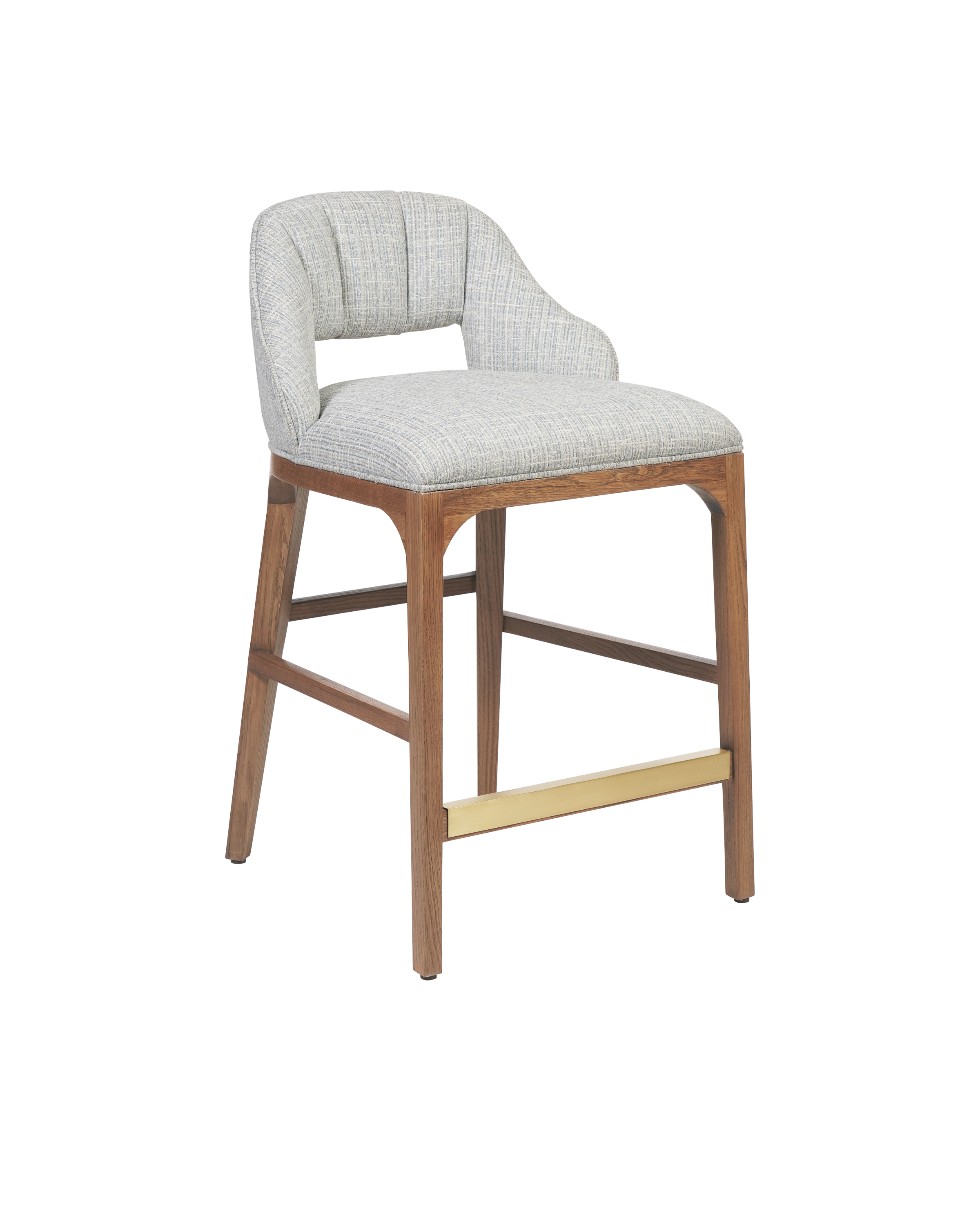 The Inga Counter Stool covered in a Greenlight Powder fabric has an upholstered back and seat that sits nimbly atop a solid oak frame in a morel brown finish. The paleness of the fabric and the warmth of the wood create a soft contrast, while the brass kick-plate brings a bit of brightness to the design.
