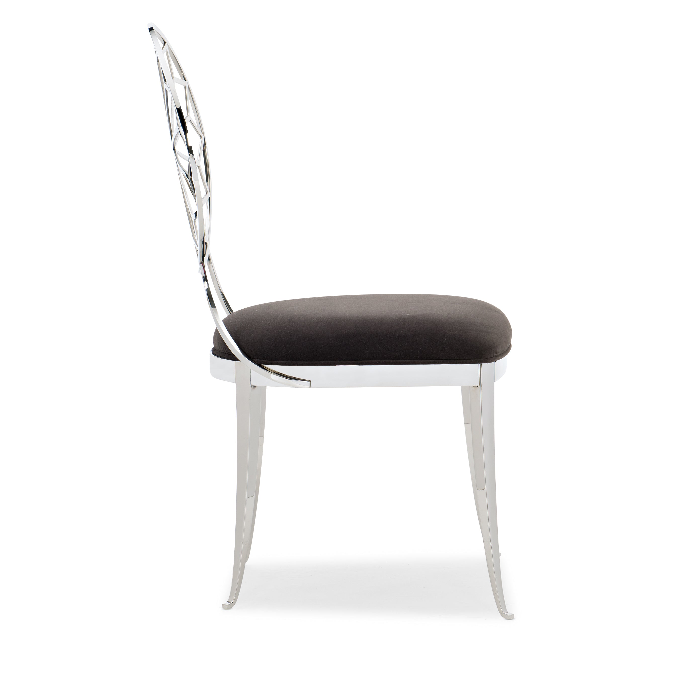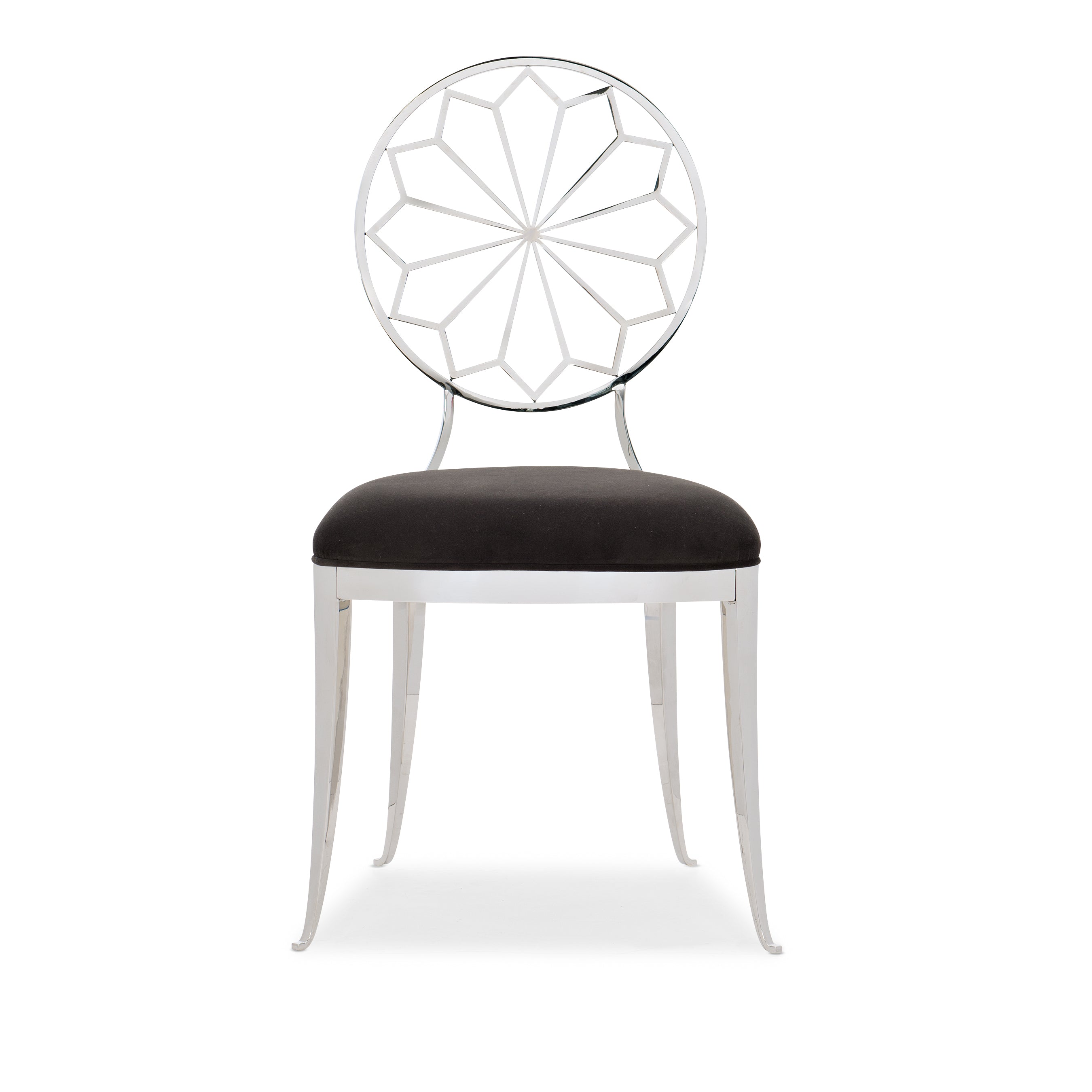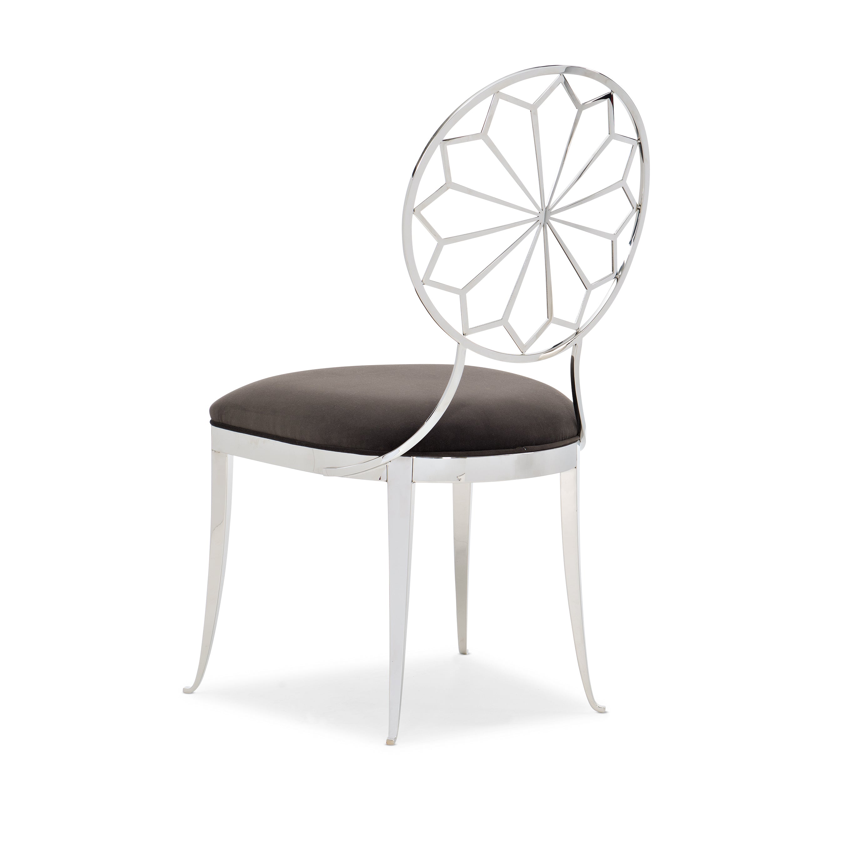 Add a measure of romance to your dining room with the modern charm of this distinctive chair. It’s round back is both supportive and stunning—featuring an exquisite contemporized Moroccan pattern highlighted in polished stainless steel. Shapely legs and an upholstered seat ensure its lasting comfort for leisurely dinners and lingering conversations.