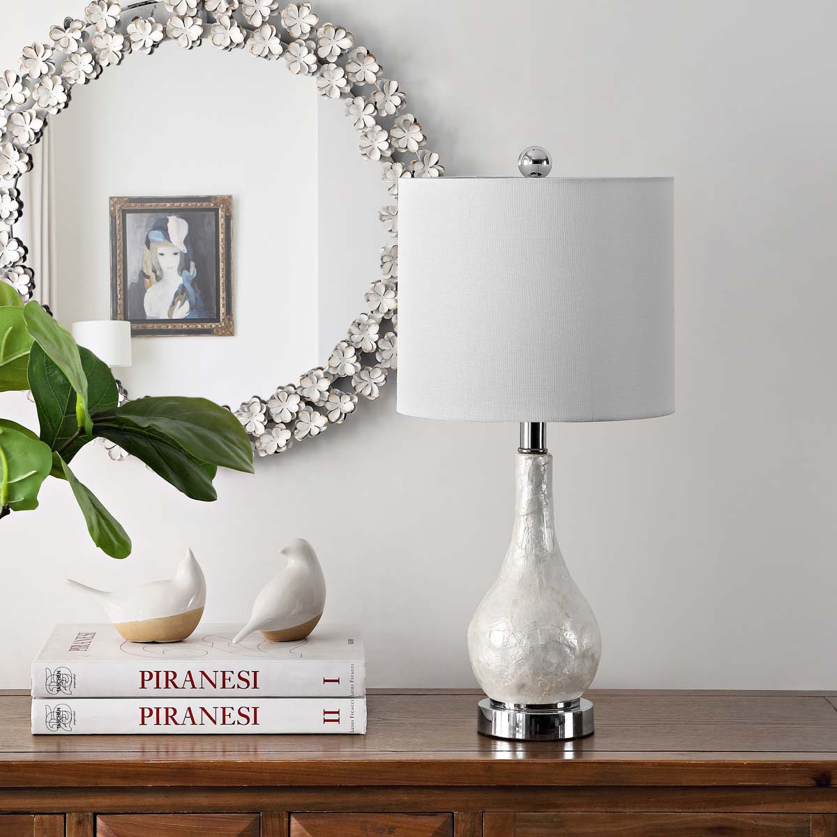 The pearlescent glow and dramatic silhouette of this Isla Table Lamp makes it a must have for today?? contemporary d?cor. An organic mosaic of ivory seashells overflows with unmistakable glamour that beautifully enhances Isla?? sophisticated shape.