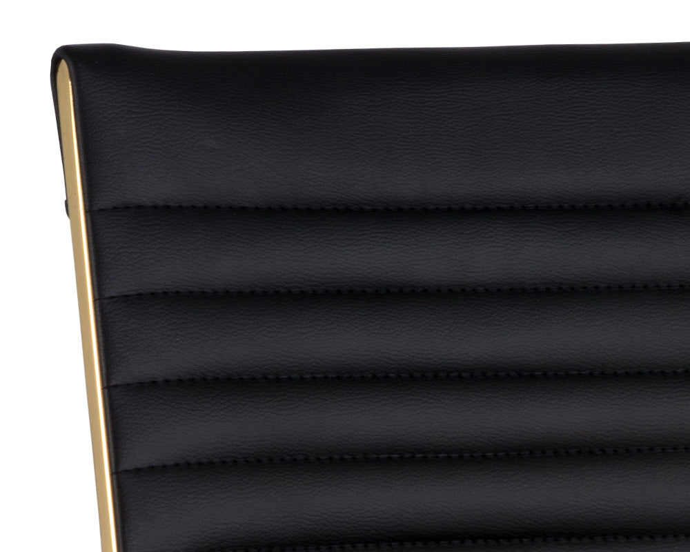 This office chair offers glamorous femininity. Features horizontal channel tufting on the seatback with a stunning polished gold steel frame and castors for mobility. Stocked in black faux leather. Handle With Care: This design has been crafted with faux leather. Faux leather is manufactured to reflect the natural characteristics of leather; as such, colour variations, markings, wrinkles, grooves, and light scratches are appreciated characteristics. No two pieces will be alike. Visit our Product Care page for more information on how to ensure the lasting beauty of this piece.