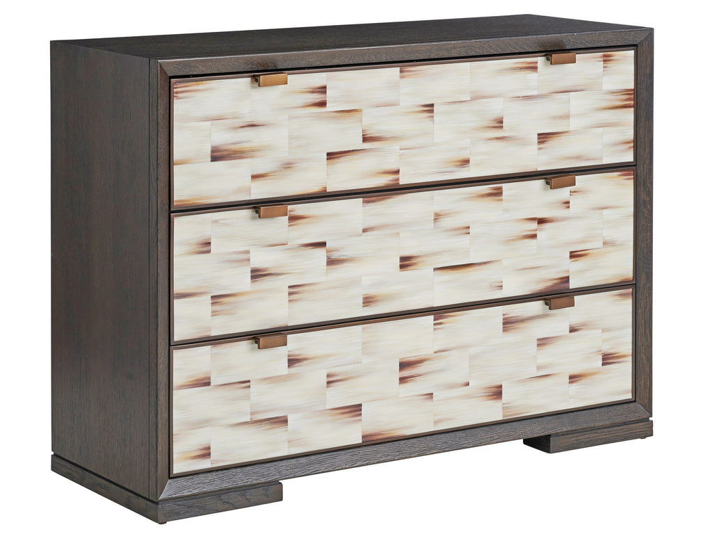 The 48-inch hall chest features three drawers with a faux horn front panel, with metal perimeters and drawer pulls in the burnished bronze finish. The size functions beautifully as a mid-size dresser for smaller bedrooms, making a great design statement. Metal inlay around perimeter of the 3 drawer fronts.