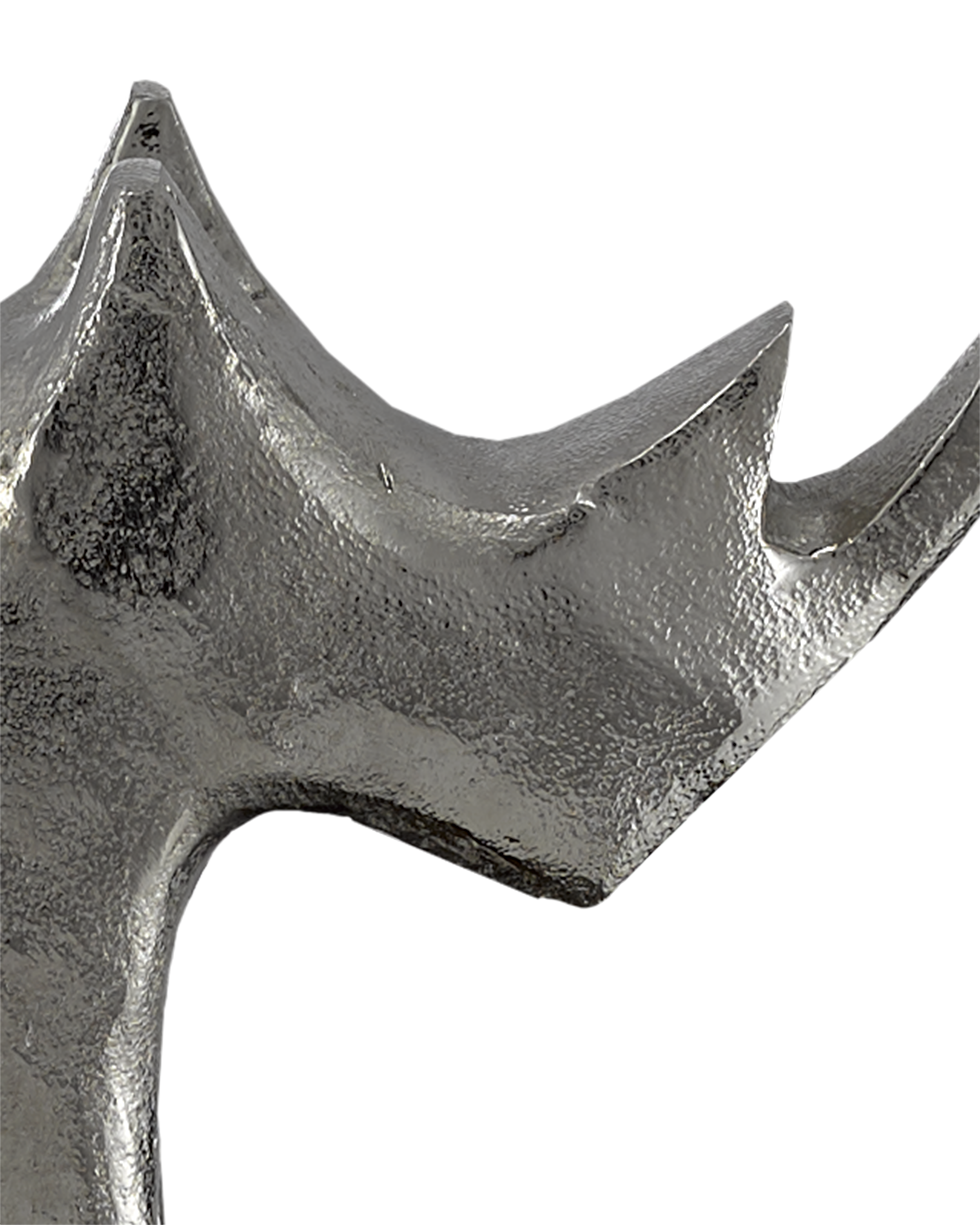 The Kano Large Silver Rhino is made of cast aluminum in a silver finish. The stippled surface brings this silver sculpture with its implied features an extra dose of charm.