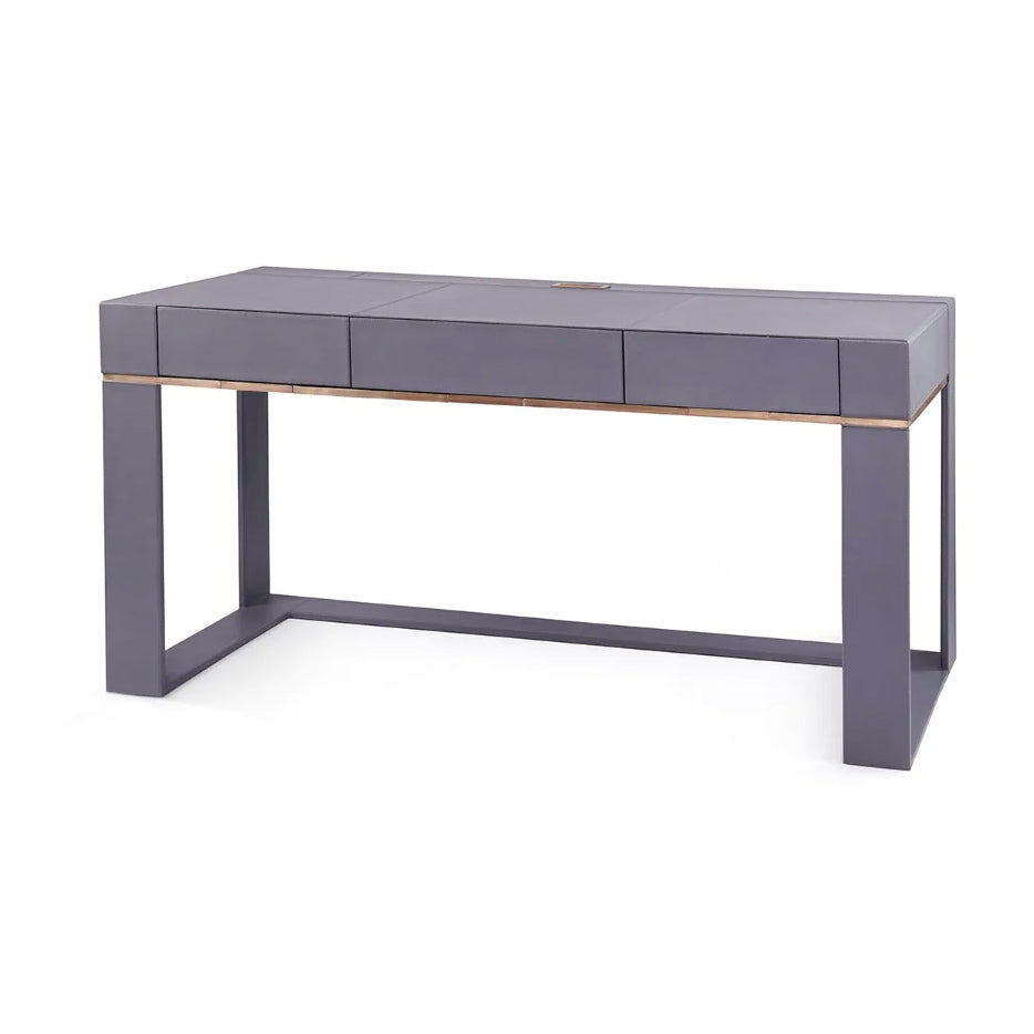 The new Landon Desk from Villa & House has a significant, masculine presence for your next home office, library, or dressing room. With thoughtful details like a convenient wire chase in the rear, micro-suede interiors on three drawers with soft-closing glides, and a masterfully hidden shelf for your surge protector or extension cords, we’ve thought of everything with the Landon. The fully-wrapped leather desk features gorgeous stitching, bronze details, and interestingly perpendicular legs. Notice the minimal pulls that seamlessly blend into the bronze wrap.