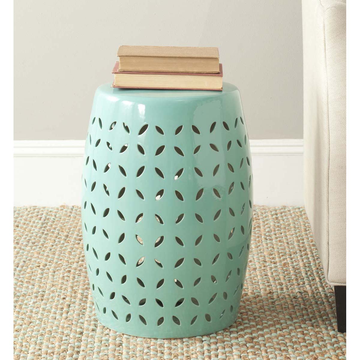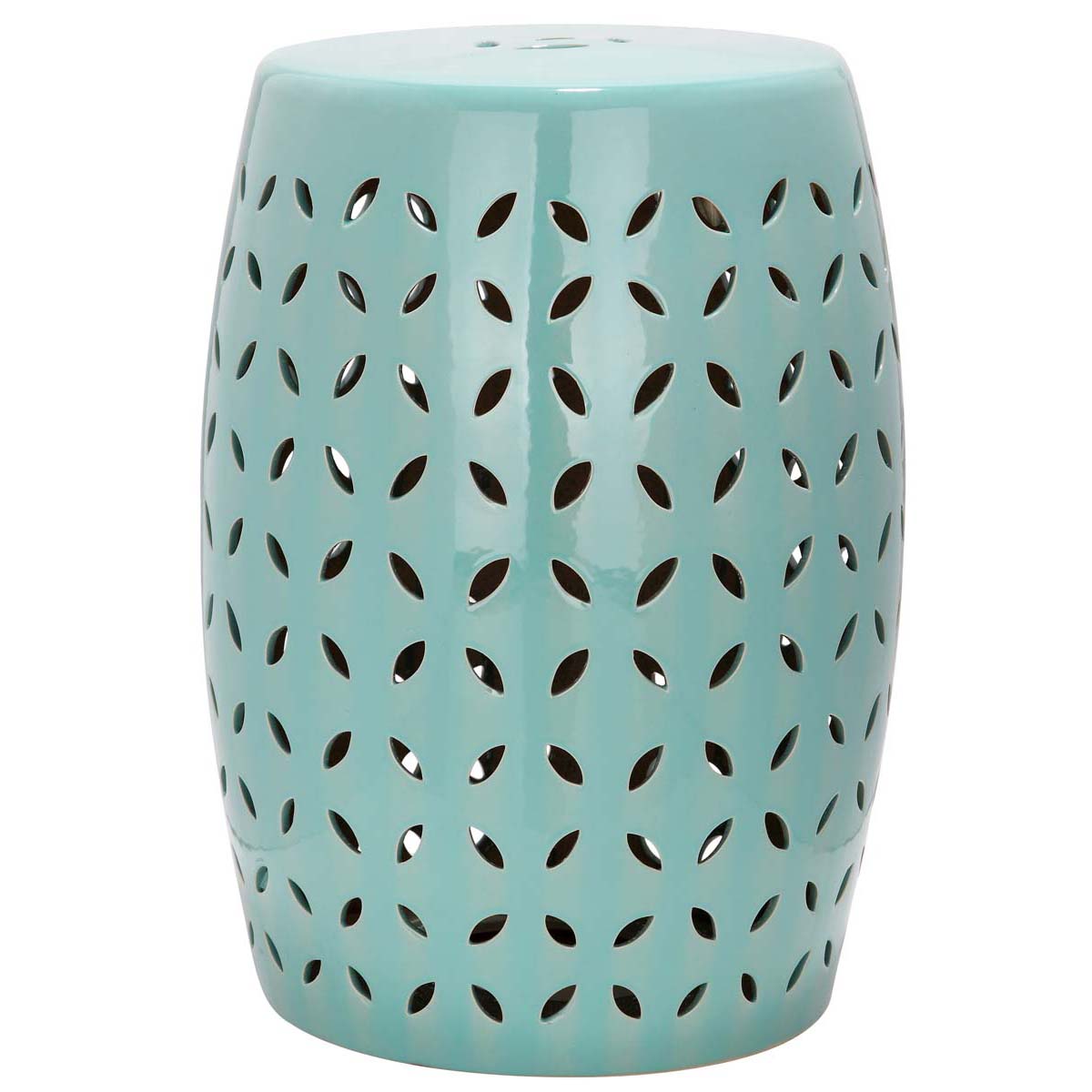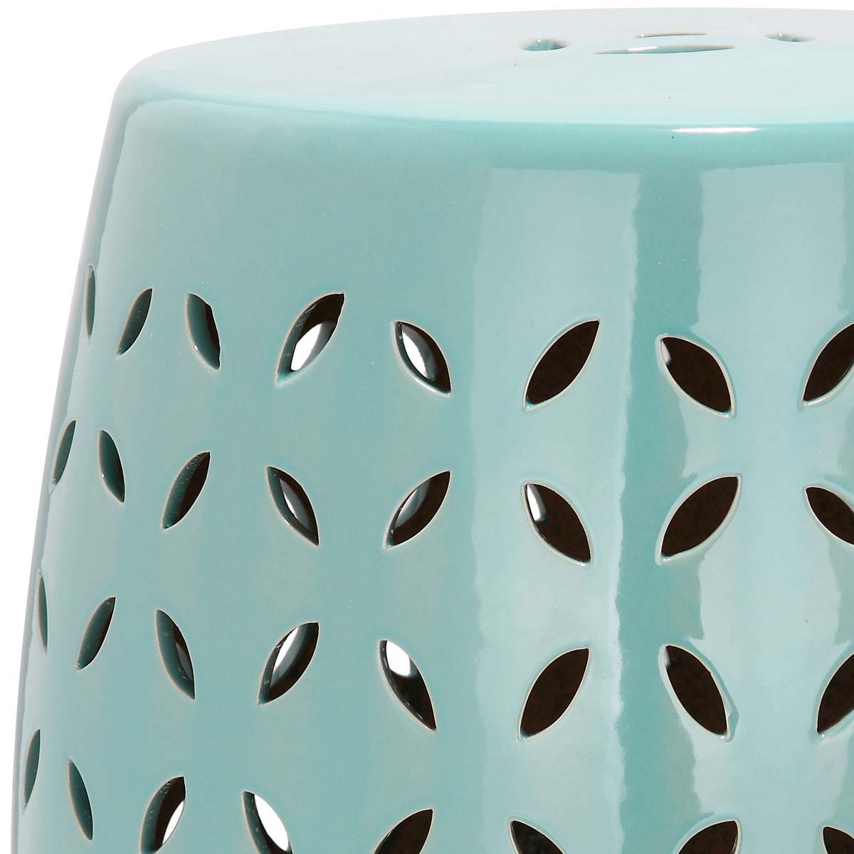Embellished with a pierced lattice of stylized flower petals, this sophisticated garden stool is crafted of ceramic and finished with a robin's egg blue glaze. Use solo as an accent piece or place several in a cluster for decorative drama indoors or out.