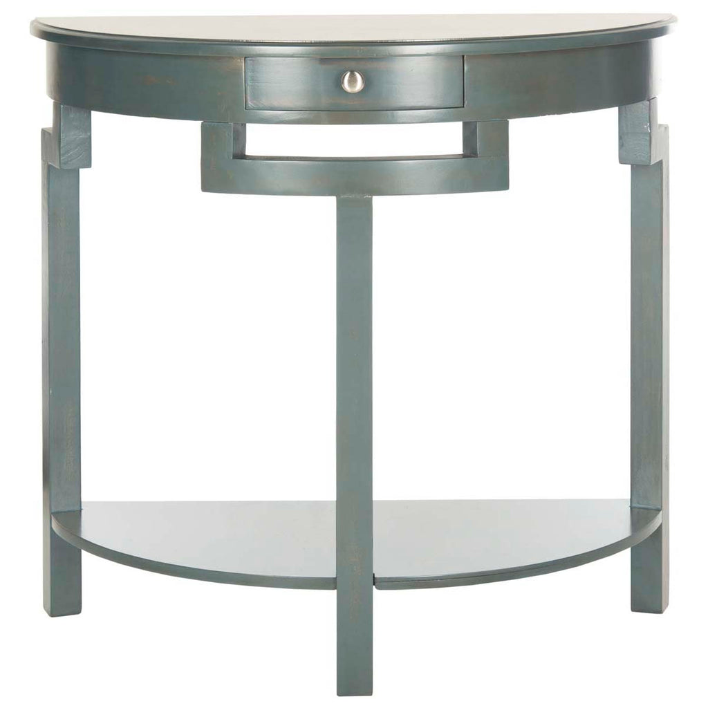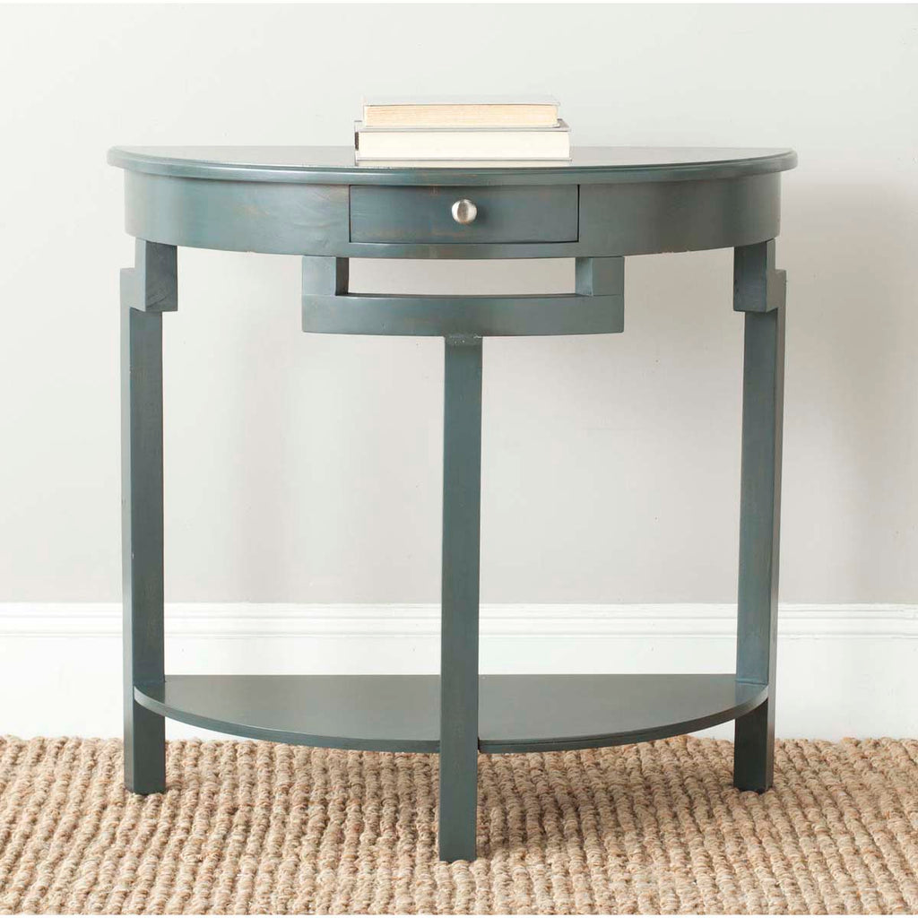 A handsome demilune table for an entry hall or living room wall, the Liana console is transitional with an industrial chic edge. Crafted of pine in a dark teal finish, Liana has a handy drawer and lower shelf for magazines or accessories.