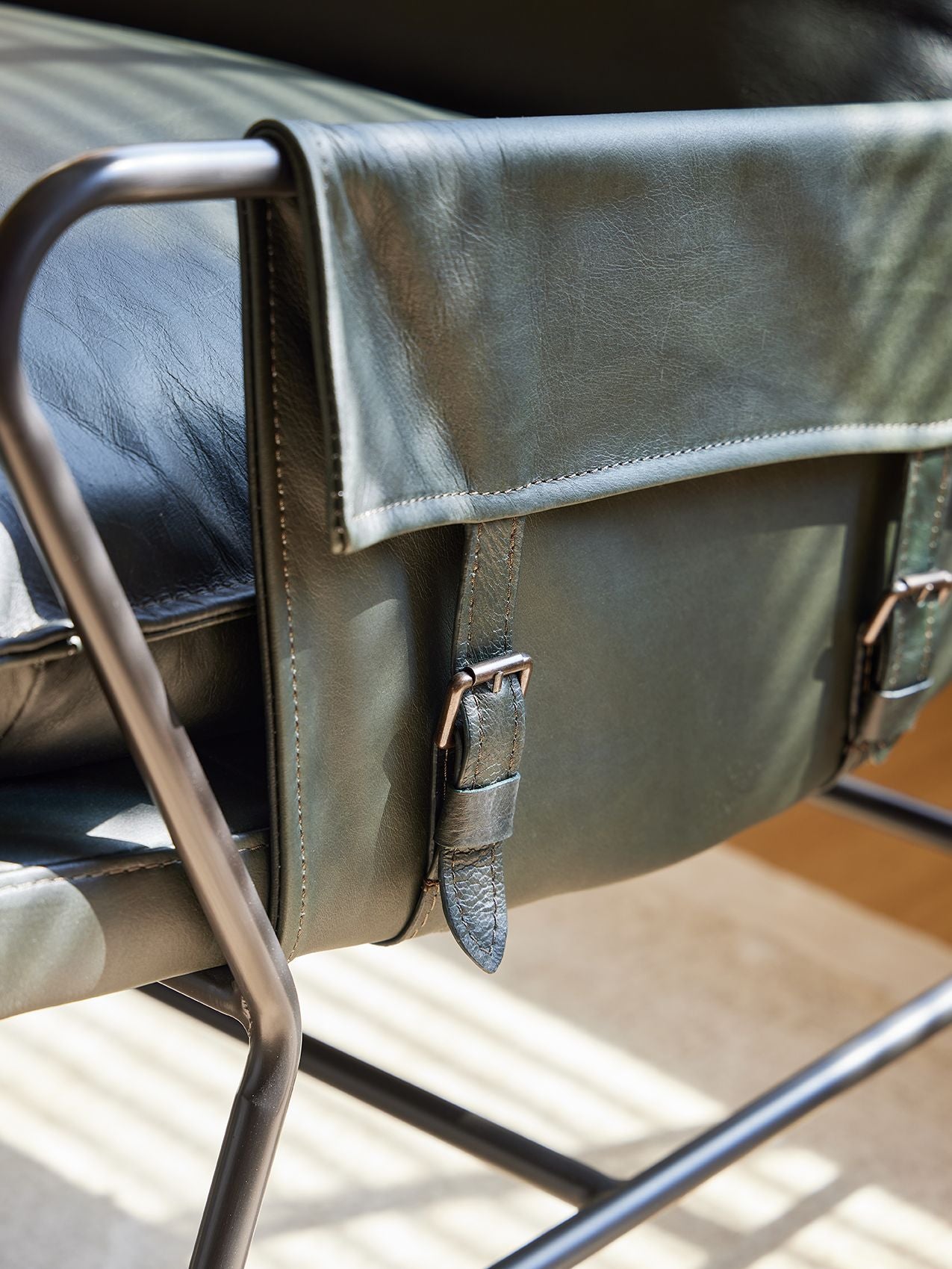 The MEIER Lounge Chair combines style and comfort with its rich moss green and mocha brown leather upholstery. Featuring a unique sling-style design that wraps around the armrests, each chair showcases distinctive wrinkles and creases that develop into a relaxed vintage look over time. The sturdy steel frame, finished in charcoal-iron powder coat, ensures durability, while the plush seat and backrest provide exceptional comfort, making it a perfect addition to any modern living space.