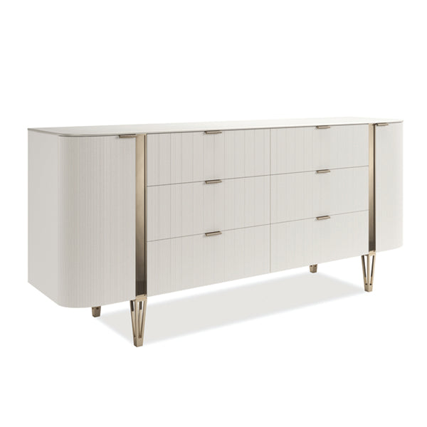 Love At First Sight has been elongated to 78 inches with two end doors with interior shelves and six center drawers. A full-covering of Matte Pearl accentuates the exquisite reeding on the fronts with Whisper of Gold metal band detailing and designer legs. The piece has a gracefully rounded rectangular profile. The drawers are felt-lined with under-mount guides.