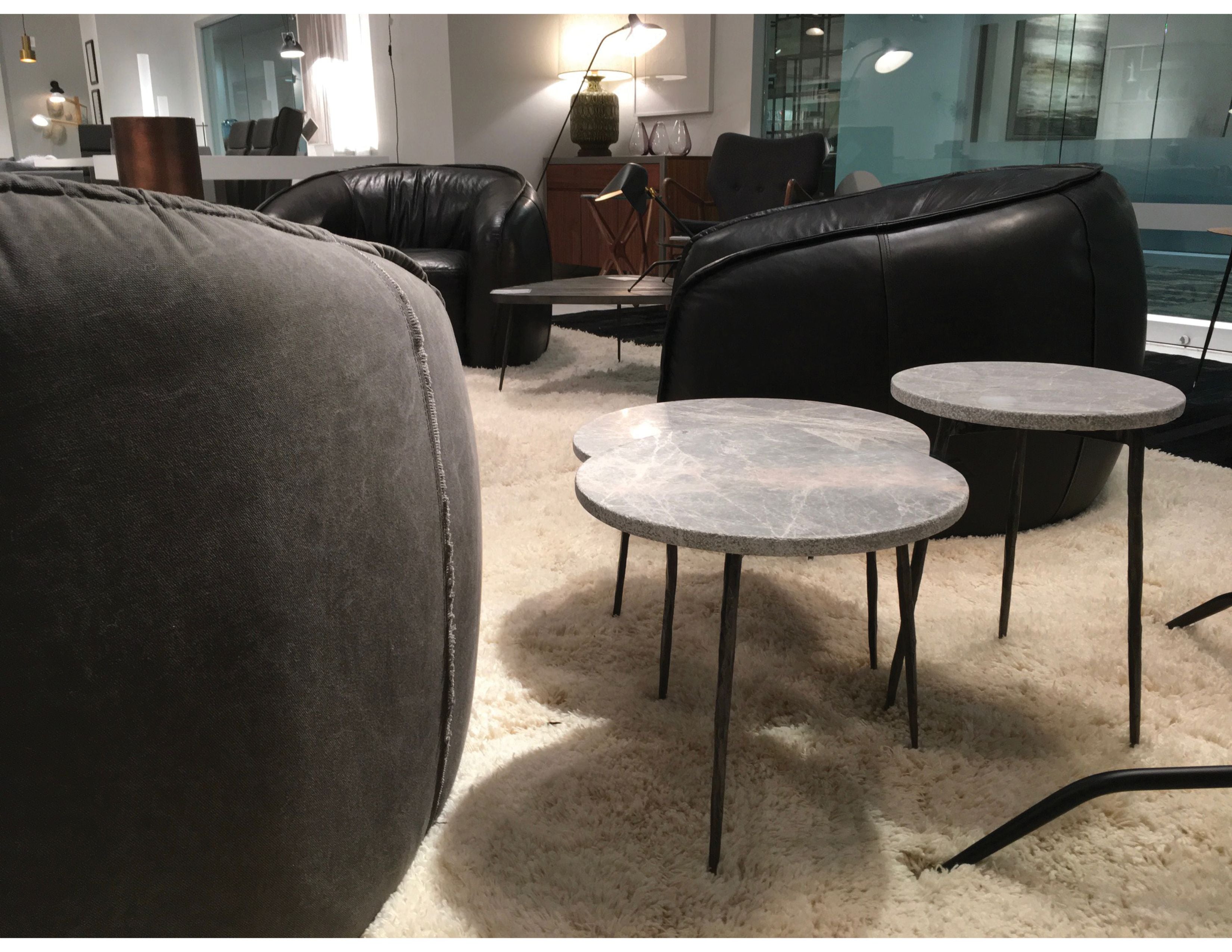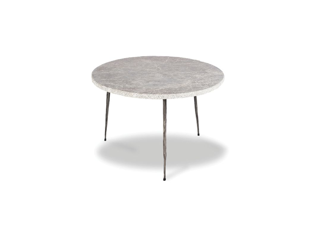 Raw materials meet industrial artisanal craftsmanship at the KAII nesting table. The Italian grey marble has a beautiful hammered pebbled rough edge and the black hand forged steel legs compliment it beautifully.