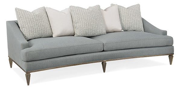 Stylishly expressive, this sofa’s low-key elegance is a vision to behold. A low back and sloping arms cradle the loose back pillow and create an updated traditional aesthetic that’s tailored to perfection. It features two seat cushions and is upholstered in a soothing granite grey accented with pillows in a platinum and cream matelassé and a cream dupioni satin. Adding a touch of refinement, its base and legs are finished in Taupe Silver Paint.