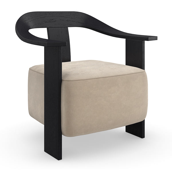 Sleek in its simplicity, this accent chair seamlessly blends modern elegance with tactile luxury. Features a soft suede seat that appears to float within its striking veneer frame. A moody Basalt finish adds dramatic contrast and a layer of opulence.