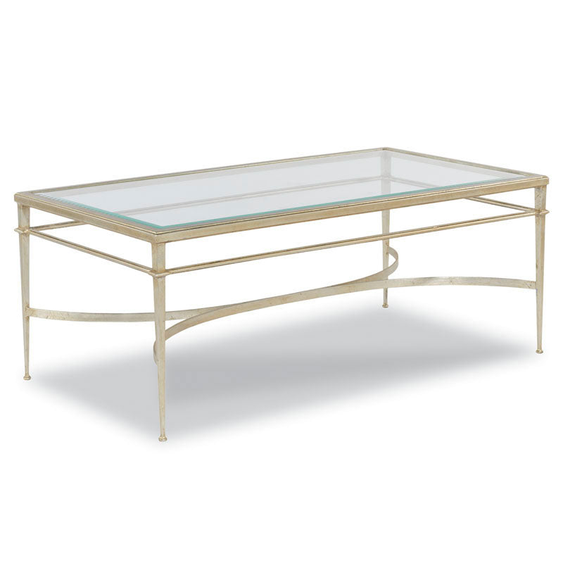 A lovely table inspired by 19th Century French originals with a rectangular "1/2" beveled glass top. The glass is fitted inside a top frame that is elevated by gracefully tapering posts, joined by shaped stretchers.