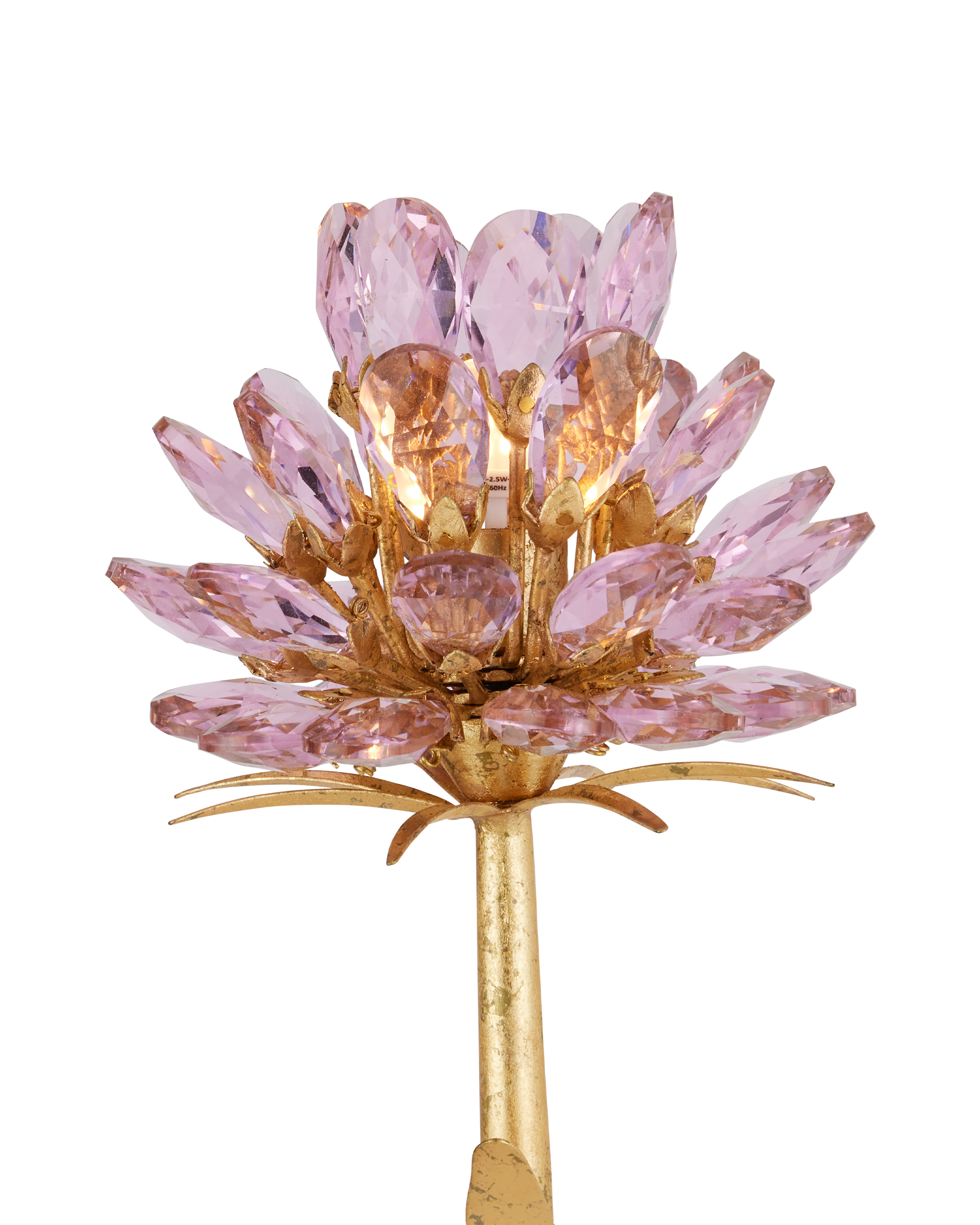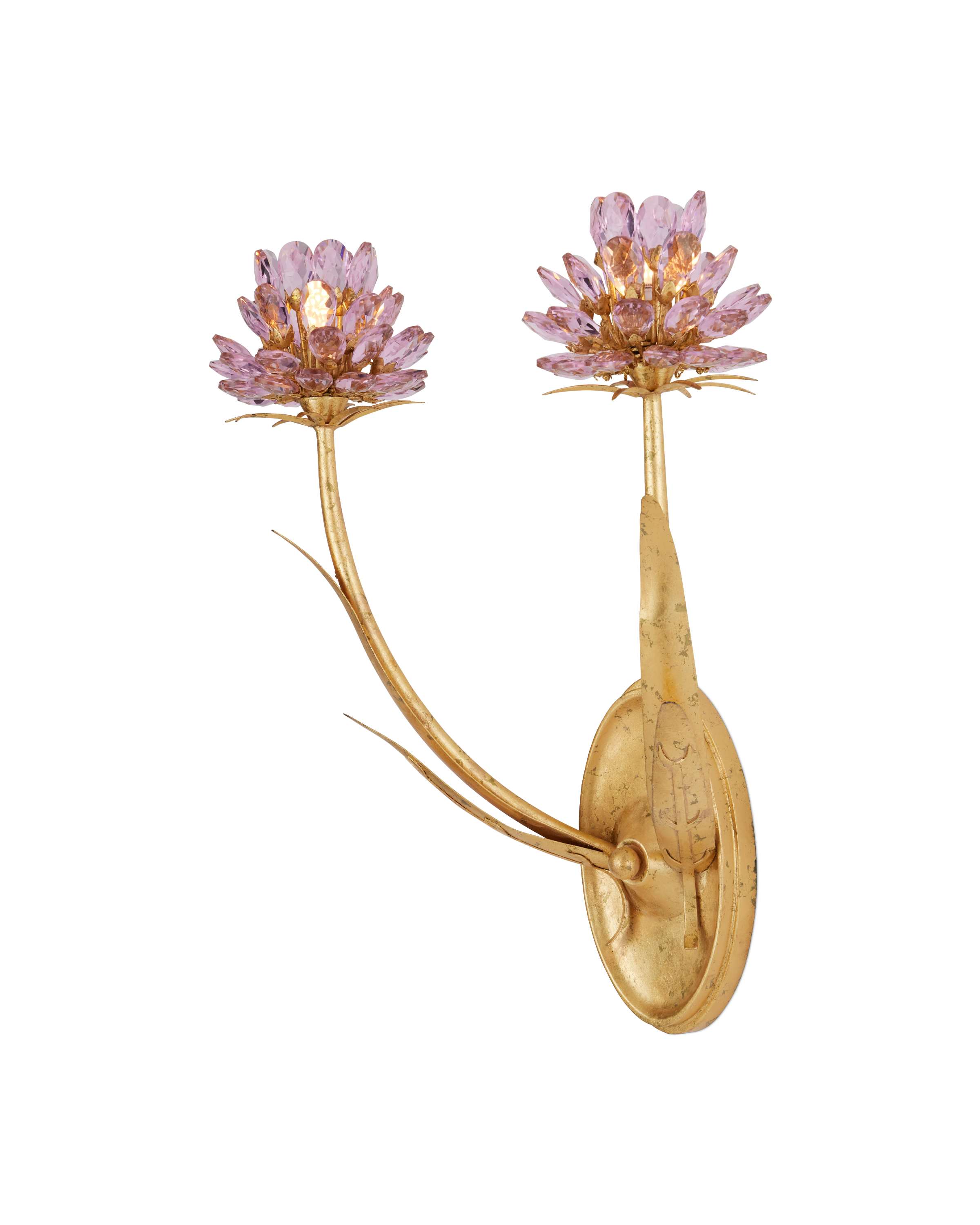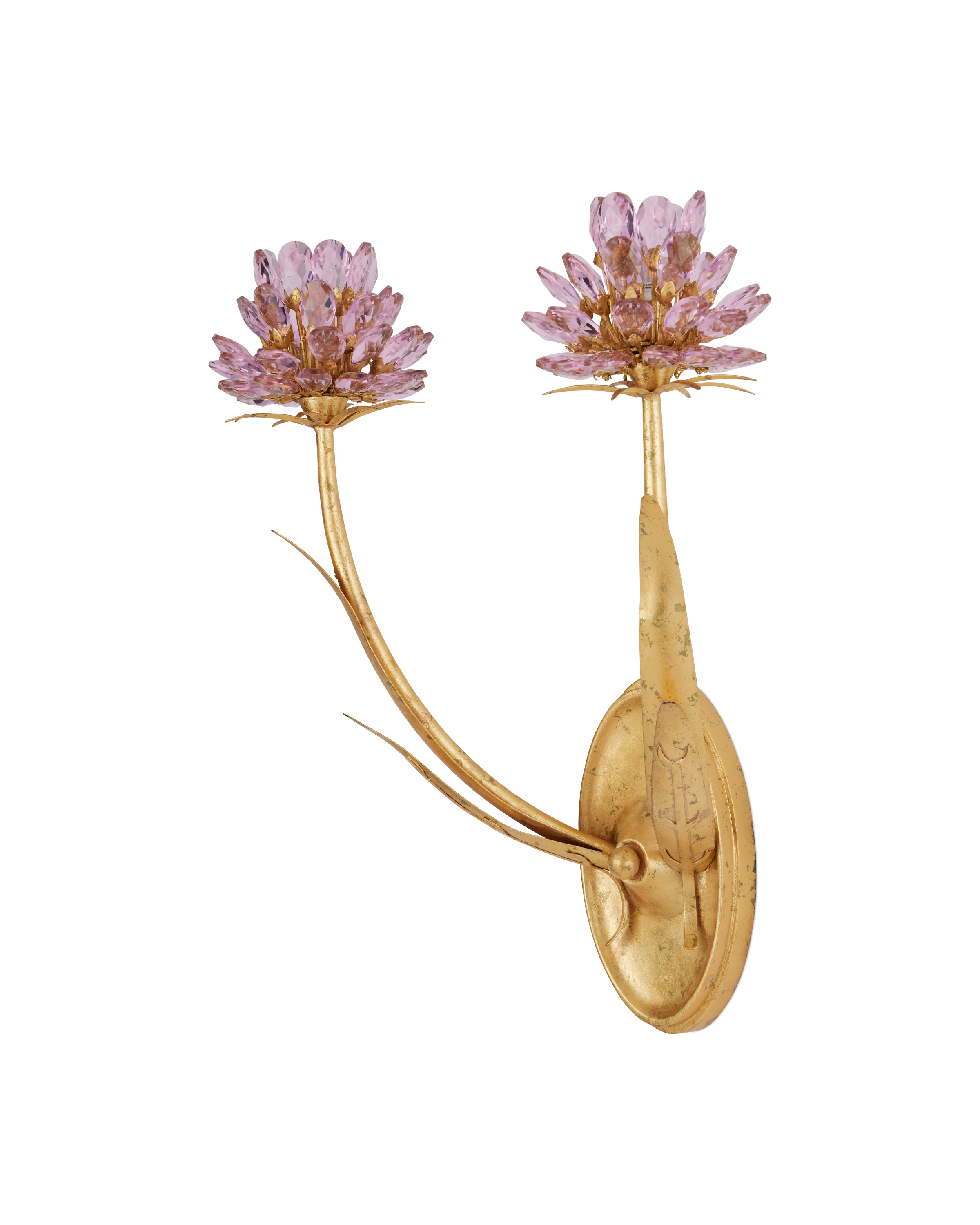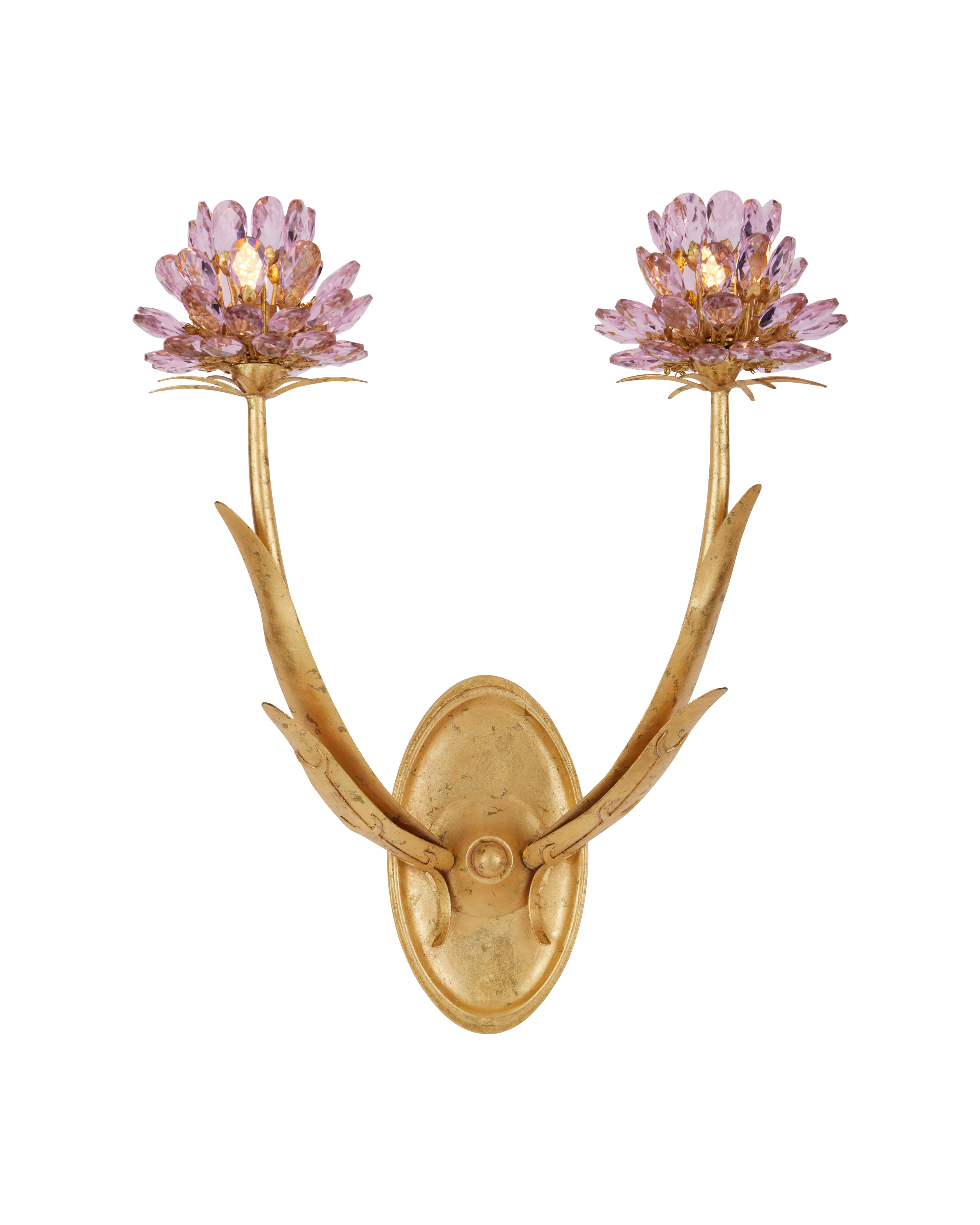 The Marilee Double-Light Wall Sconce is a luminous blend of elegance and whimsy. Finished in radiant Dutch Gold Leaf, its graceful metal stems curve upward, blooming with faceted pink crystal blossoms that catch and reflect the light. Each bulb is nestled within the sparkling glass, enhancing the natural shimmer of the crystals and creating a soft, effervescent glow.