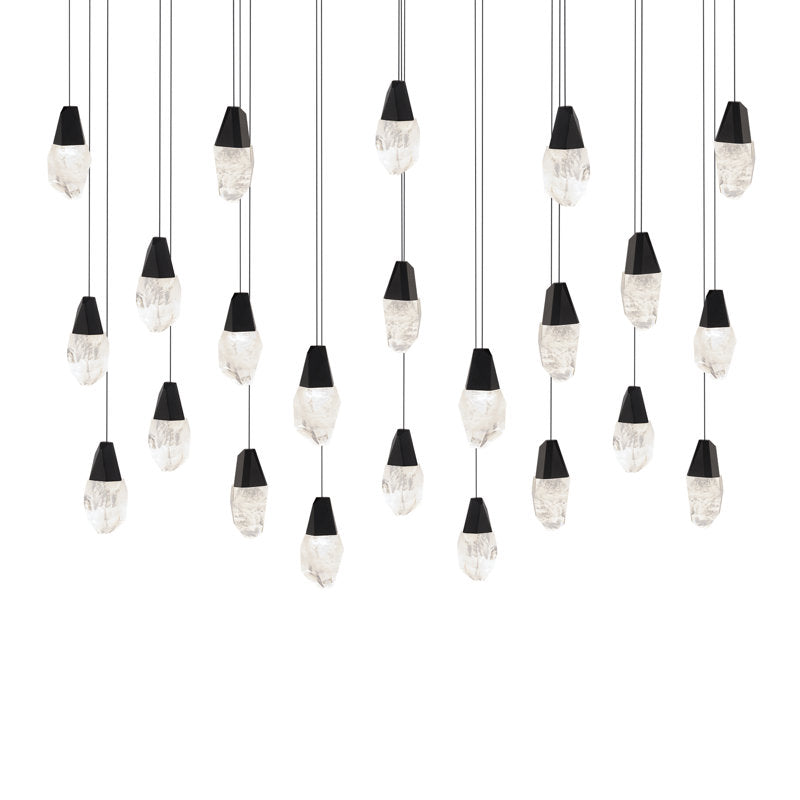 Multi Lights: A shower of jewels. Suspended in mid-air, Schonbek optic or optic haze crystal elements composed of natural quartz gemstone illuminate at varying heights to entice. Cascading from above and perfectly designed for over breakfast tables or nightstands in a bedroom to make a powerful but elegant statement. Mini Pendant: Suspended in mid-air, a jewel of Schonbek optic or optic haze crystal composed of natural quartz gemstone illuminates to entice. The chiseled metal fitting is congruent with the faceted crystal to confer elegance in design continuity.