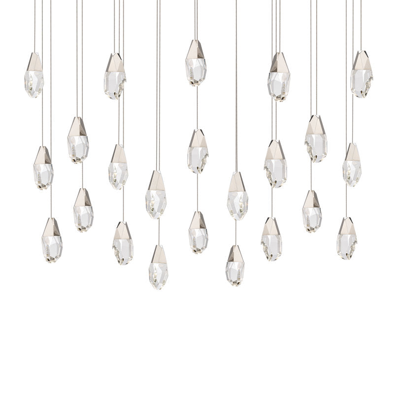 Multi Lights: A shower of jewels. Suspended in mid-air, Schonbek optic or optic haze crystal elements composed of natural quartz gemstone illuminate at varying heights to entice. Cascading from above and perfectly designed for over breakfast tables or nightstands in a bedroom to make a powerful but elegant statement. Mini Pendant: Suspended in mid-air, a jewel of Schonbek optic or optic haze crystal composed of natural quartz gemstone illuminates to entice. The chiseled metal fitting is congruent with the faceted crystal to confer elegance in design continuity.