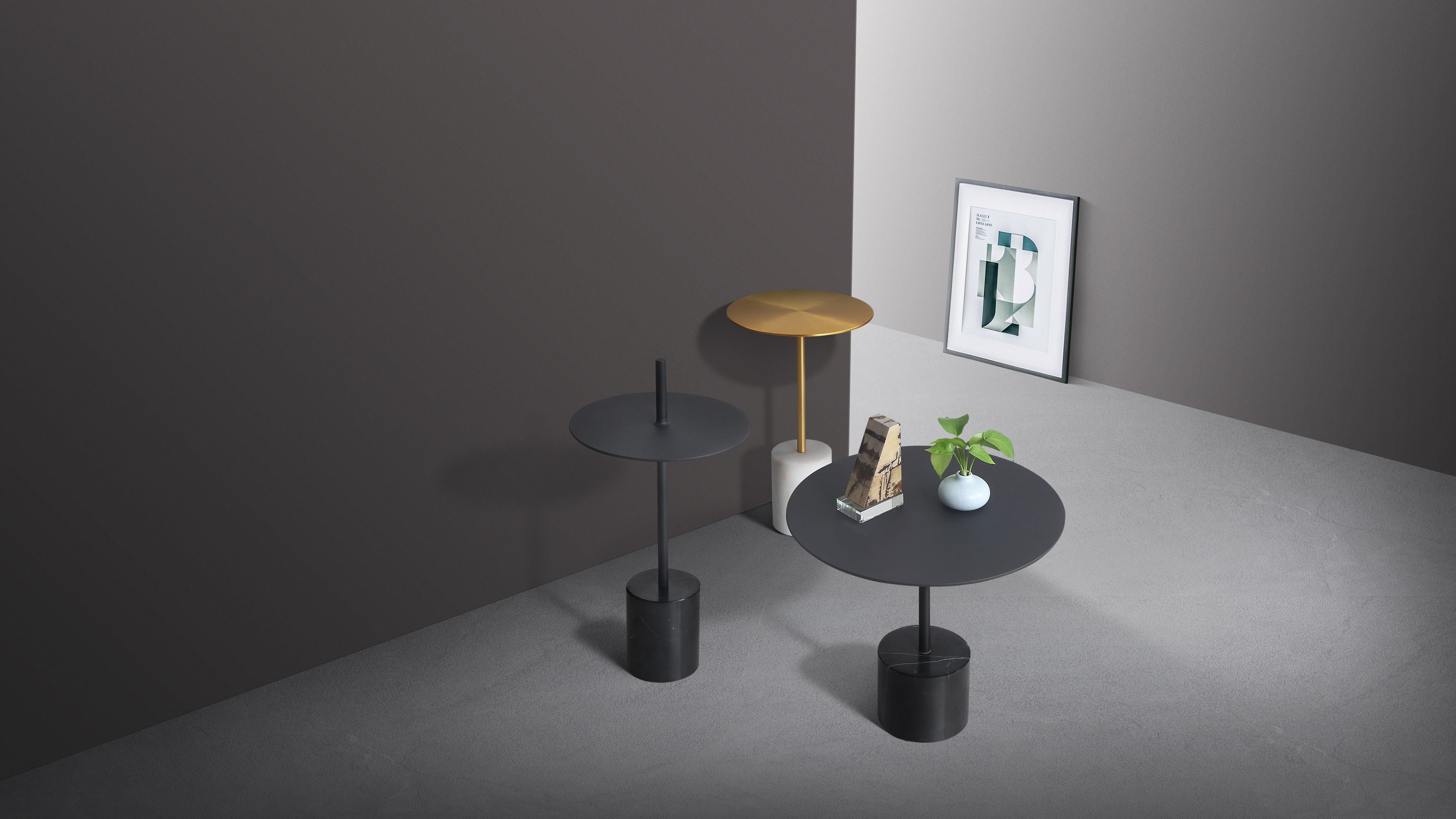 The Circulo accent tables are small in scale and come in two sizes and two finishes. Choose from black nero marquina marble with black powder coated steel or white marble with gold electroplated steel