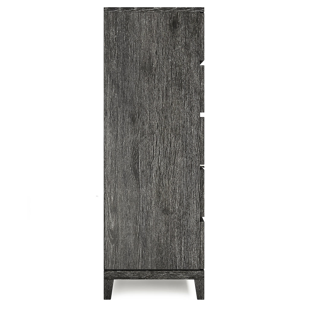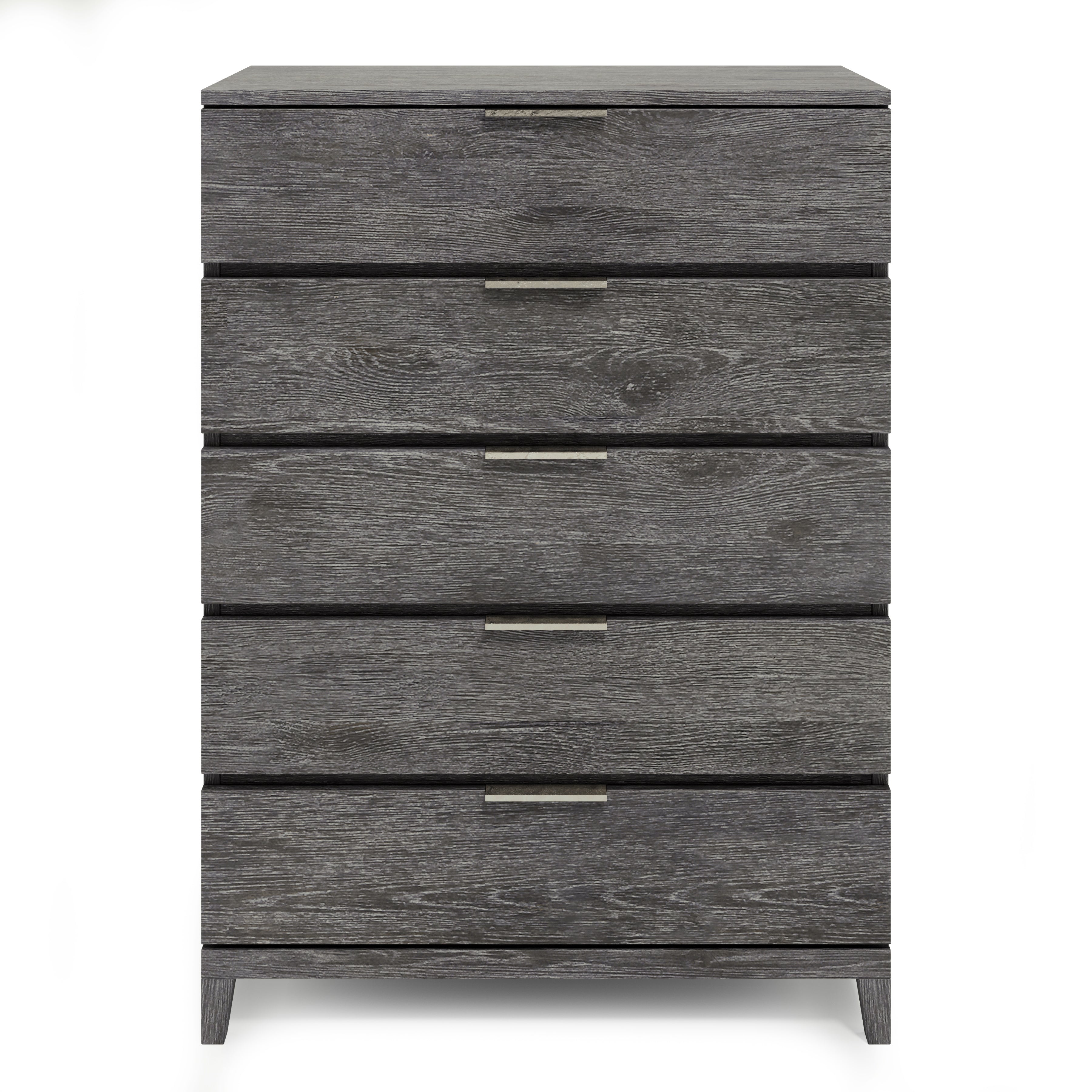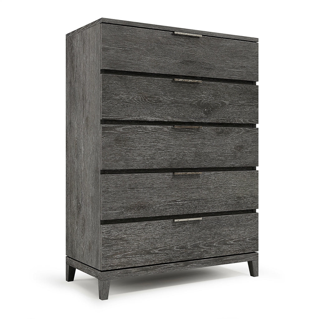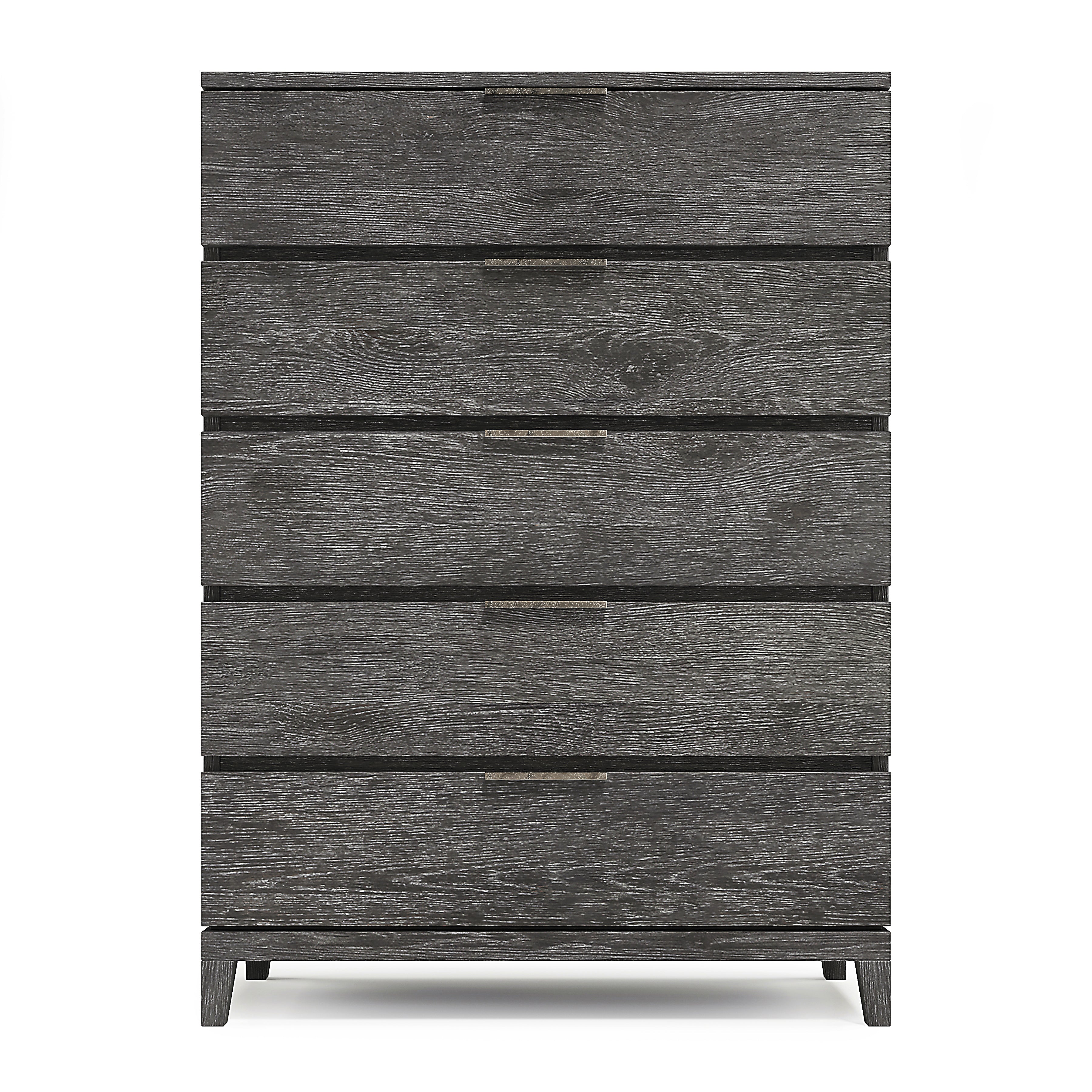 The Menton tall chest updates a traditional design with an earthy Sutton finish, highlighting the beautiful woodgrain. Five pull-to-open drawers have cast aluminum tab pulls, offering a sleek modern detail. The case rests on a base with four slightly curved legs for a casually sophisticated style.
