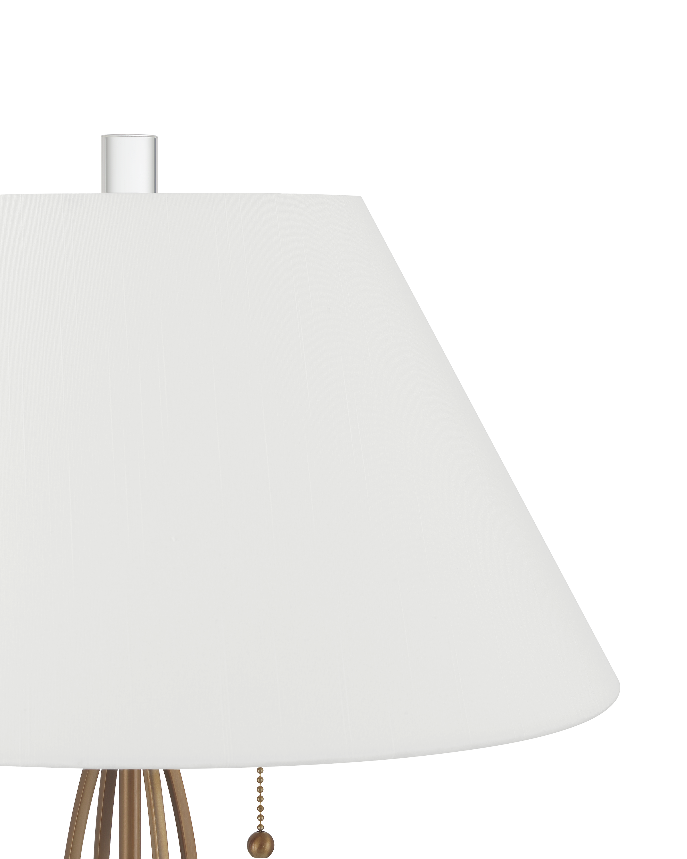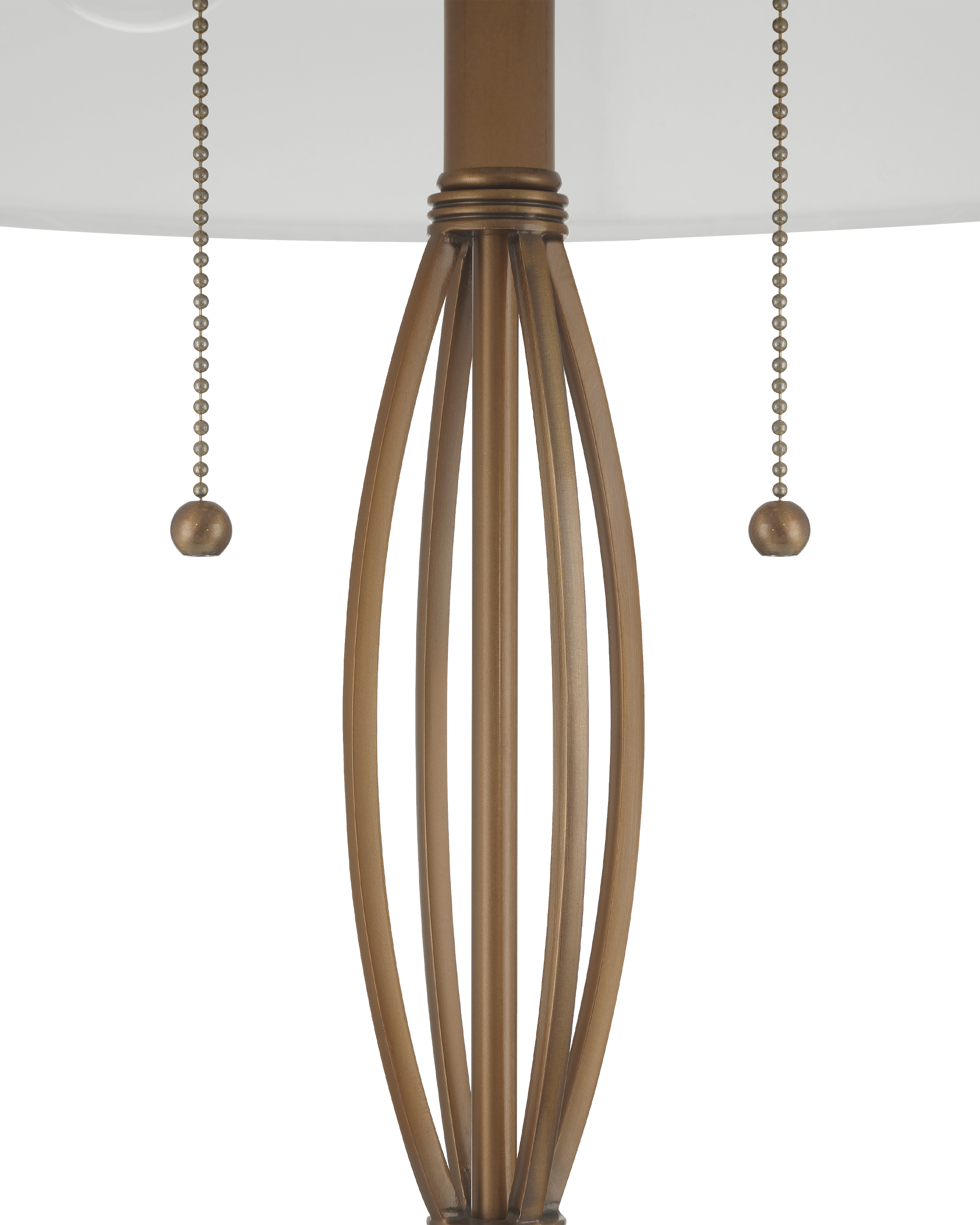 The Mizner Table Lamp is crafted from slender rods of metal in a warm antique brass finish. Banded at the top and bottom and cinched at the center, the structure swells outward in a graceful, fluted profile that feels both architectural and airy. The form rises from a clear optic crystal base toward a truncated empire shade that is secured with an optic crystal finial.