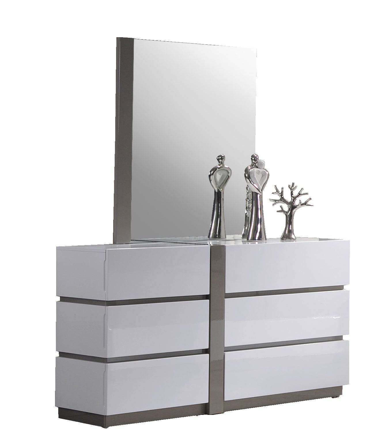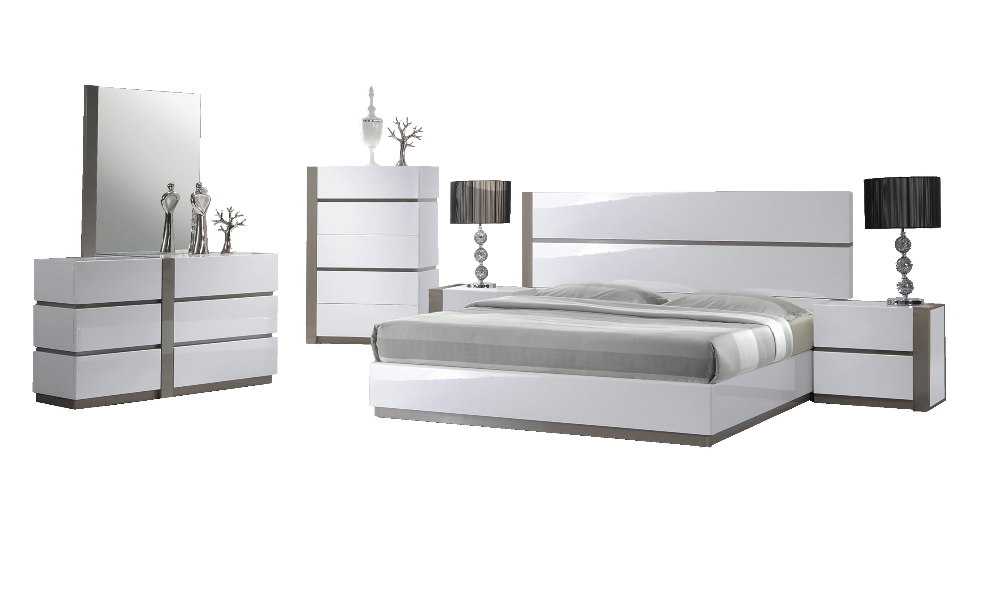 Modern bedroom set with bed, 2 nightstands, dresser and mirror, all featuring a matching moisture-resistant high gloss 2-tone white and gray finish that combines looks and plenty of storage to create the perfect bedroom setting.
