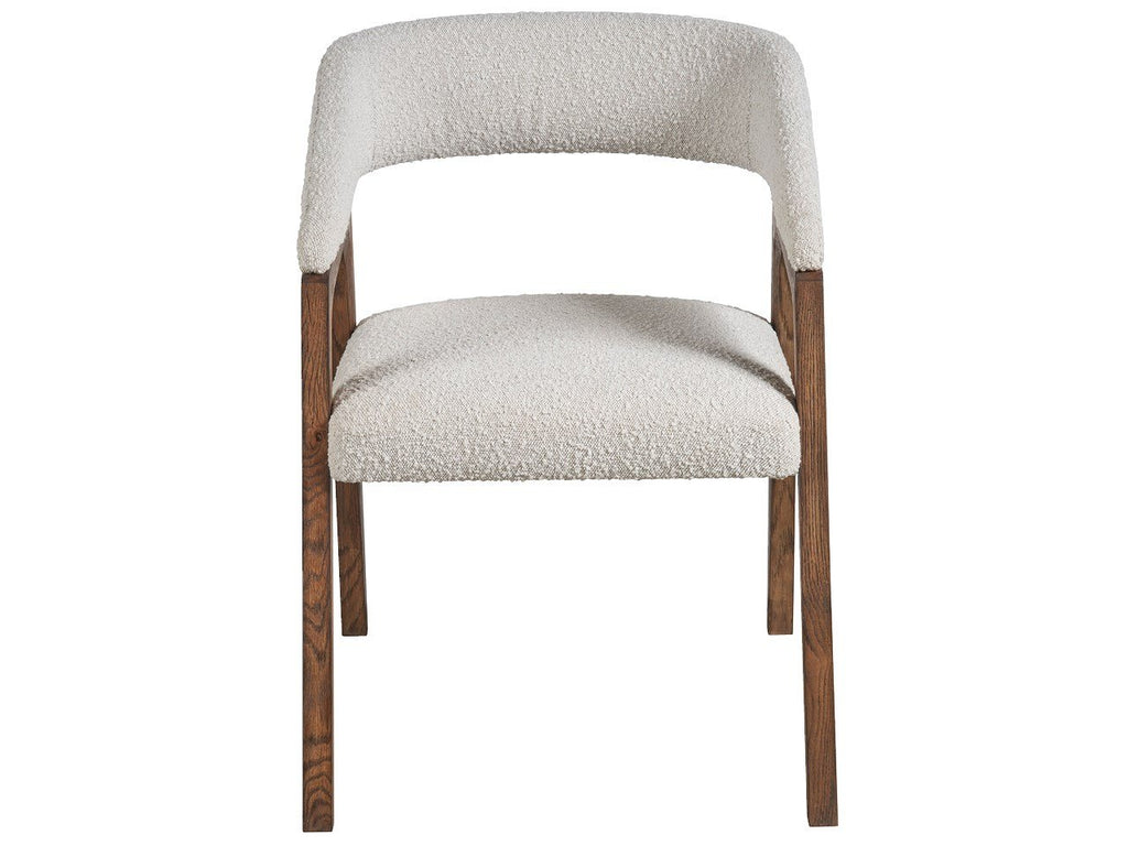 Crafted with a luxurious Medium Brown Oak Finish:, the Barrel Back Dining Chair Features: sleek, clean lines and an open back design, upholstered in sophisticated Irish Snow fabric. Its contemporary silhouette and cool, inviting aesthetic make it a perfect blend of comfort and style for any modern dining space.