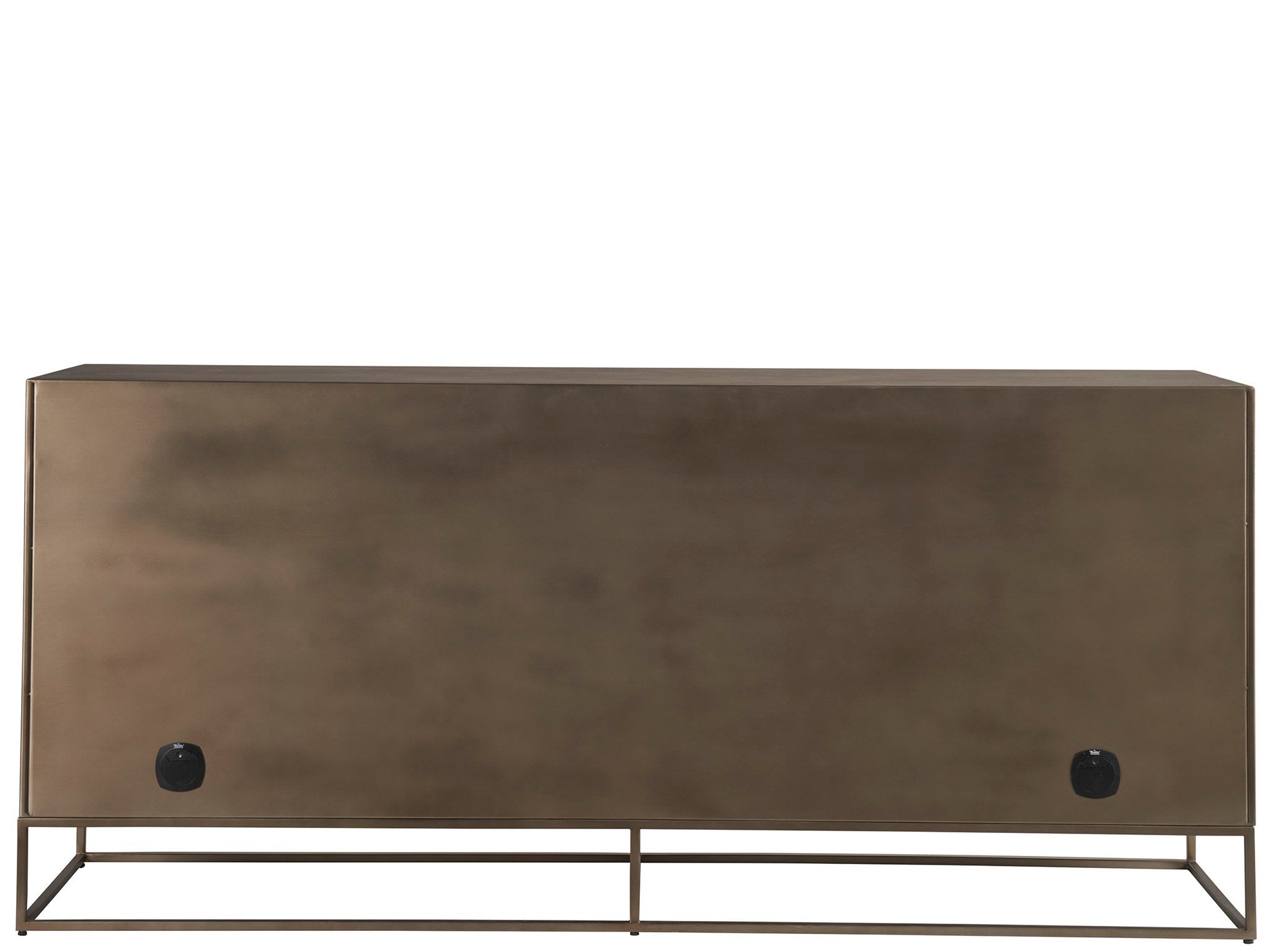 The Fusion Credenza glimmers in an Aged Brass Finish:, its surface catching the light with a radiant sheen. The doors, each embellished with a delicate, emanating pattern, add a layer of sophistication to the piece. With clean, precise lines framing its structure and two adjustable shelves nestled within, this credenza is a testament to elevated design, seamlessly blending functionality with a luxurious aesthetic