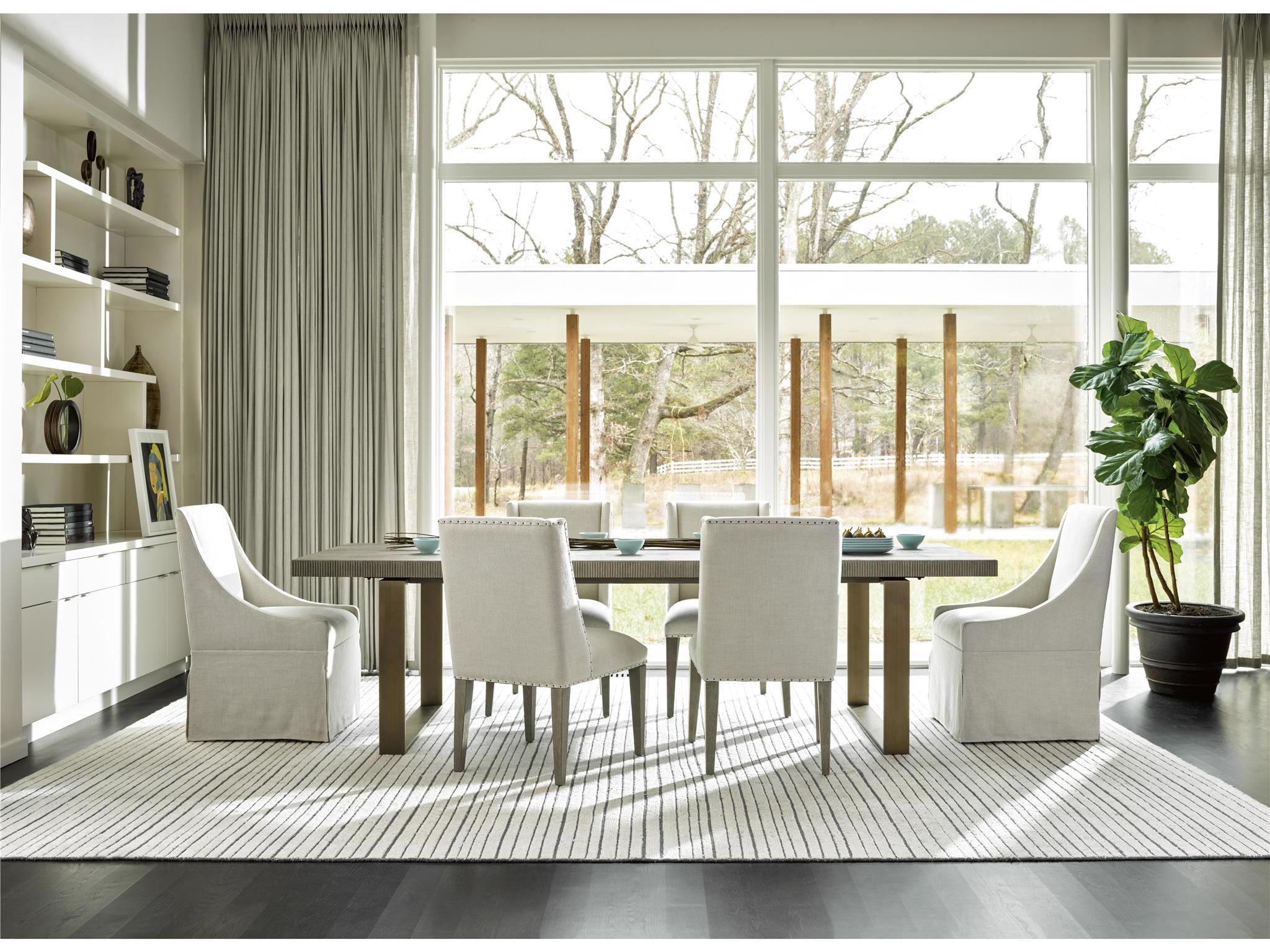 The Robards Rectangular Dining Table artfully juxtaposes a lustrous bronze base against a delicately ridged, matte-Finish:ed wood, creating a bold dining room statement piece.