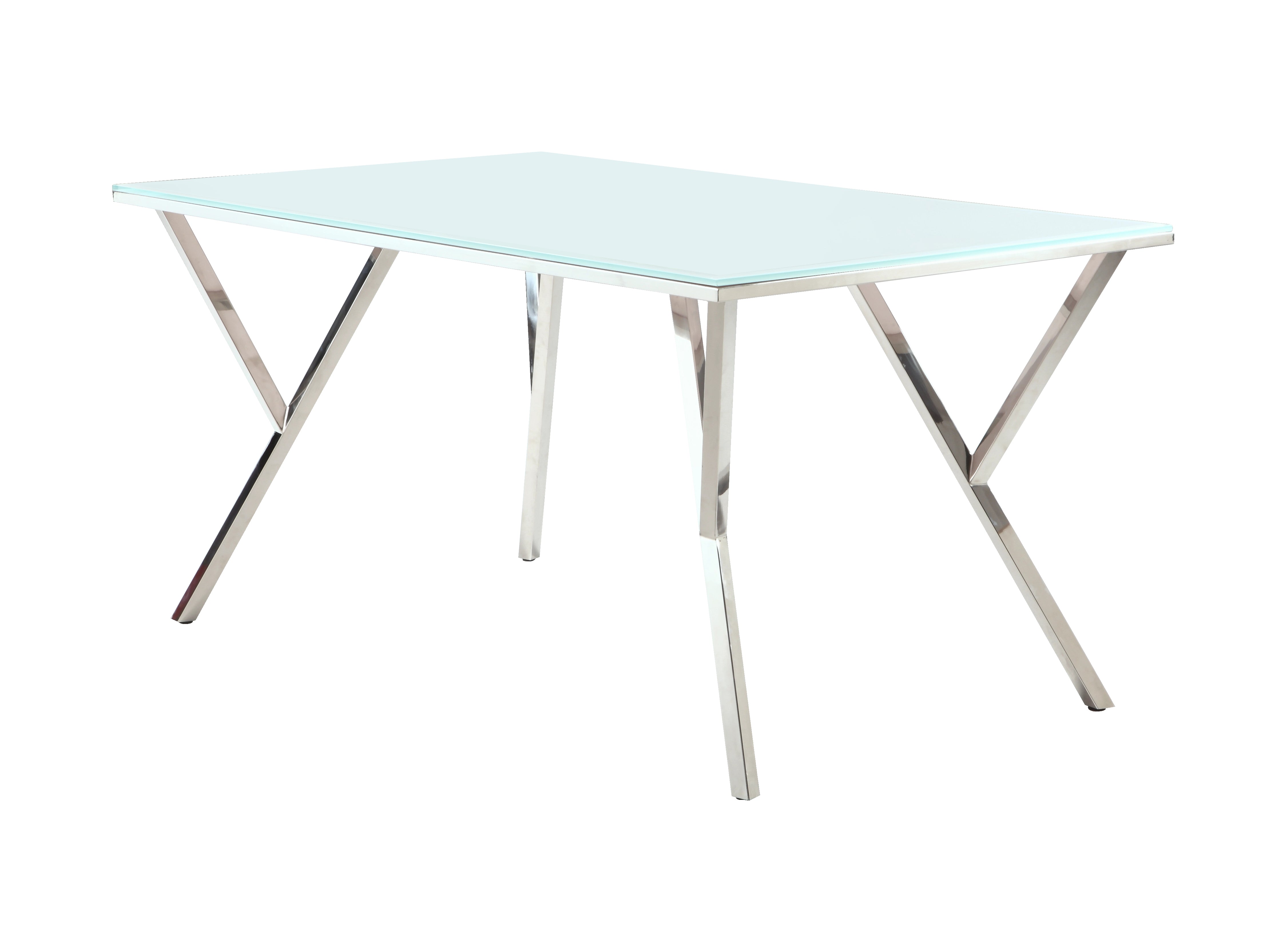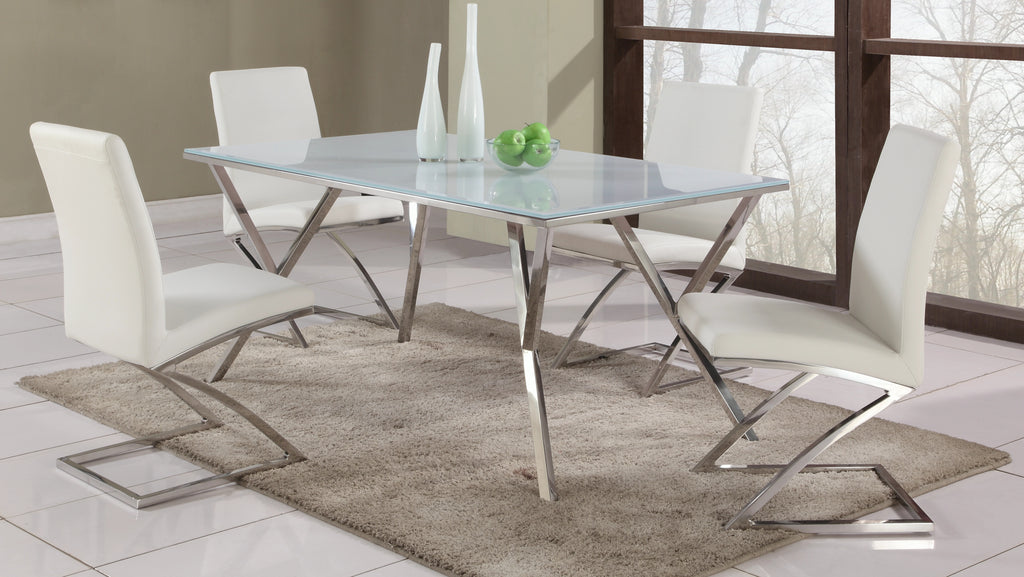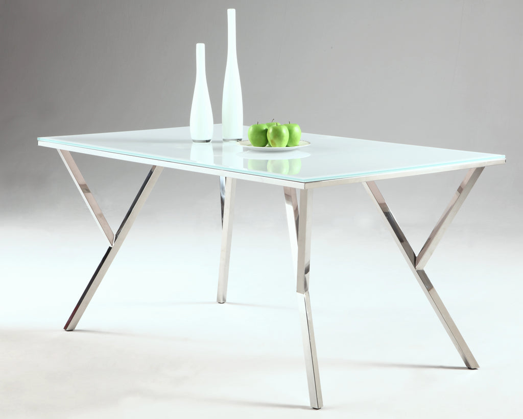 Modern rectangular glass dining table with a tempered super white Starphire glass top on a polished stainless steel frame with Y-shaped legs.
