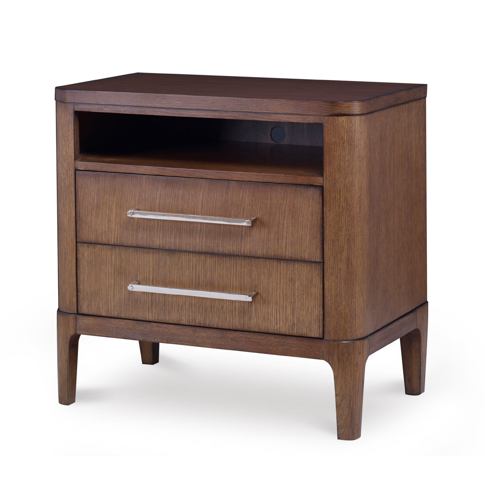 Two drawers with polished stainless steel hardware and soft-close drawer guides below open shelf