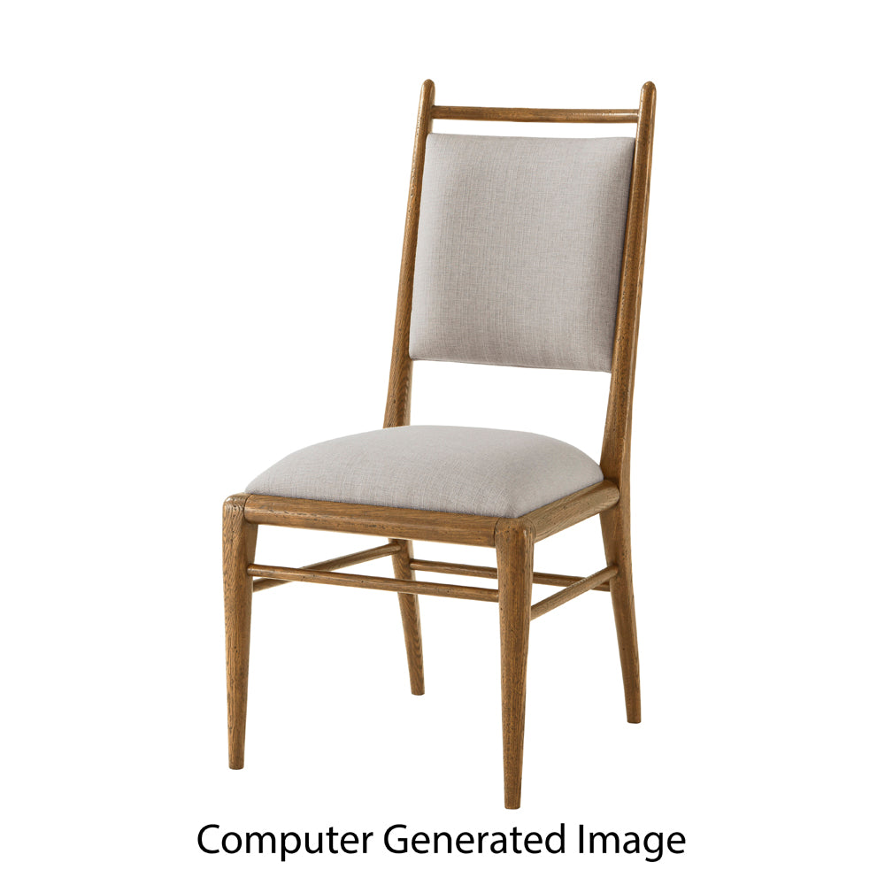 Seen in our Dawn finish, this endearing side chair displays a charmingly upholstered backrest and seat for added comfort on tapered oak legs joined by supportive stretchers.